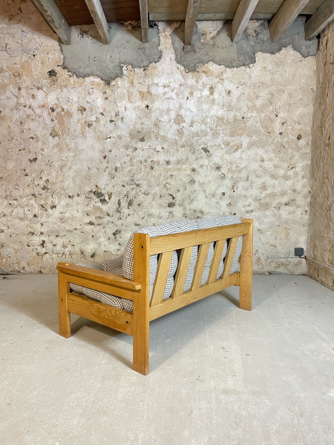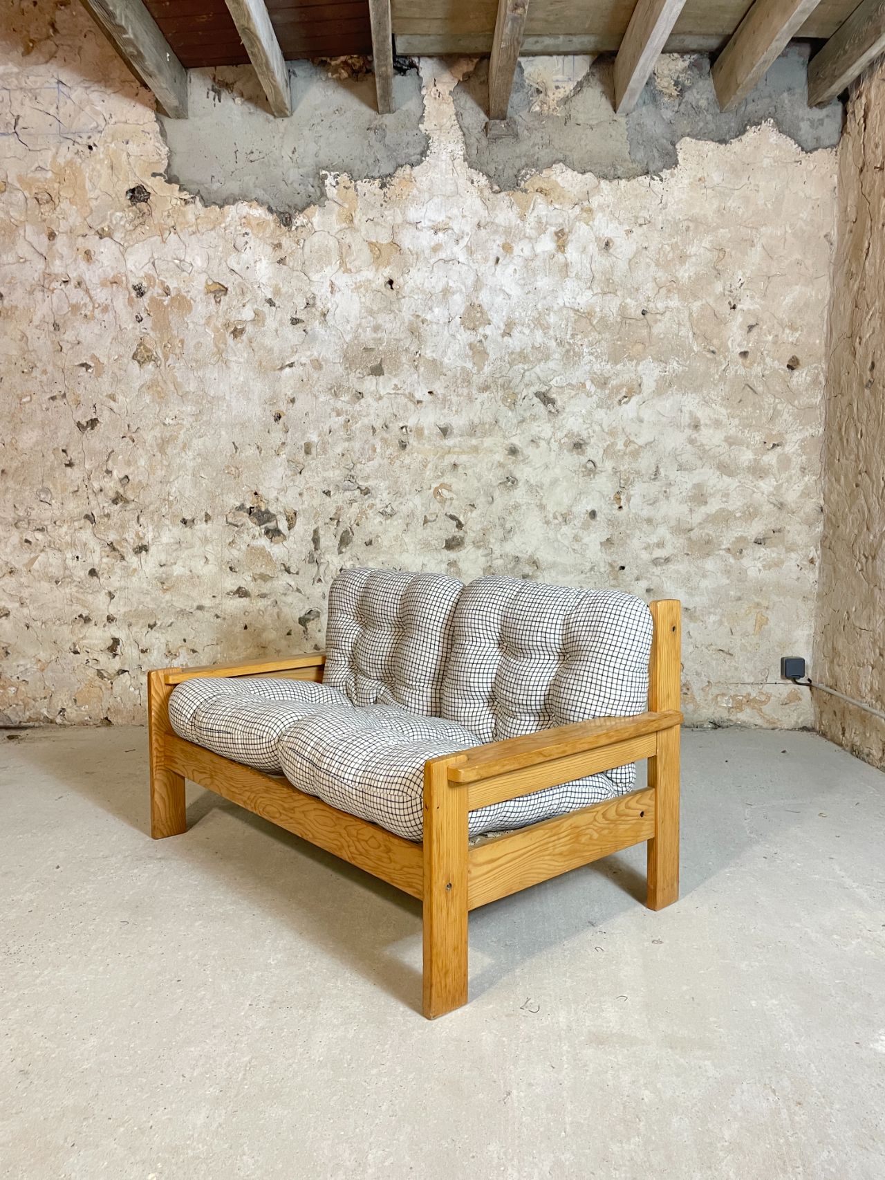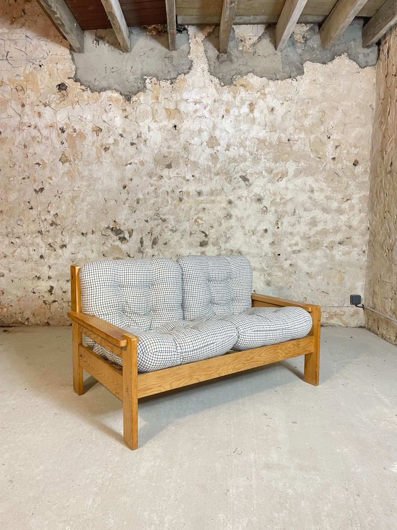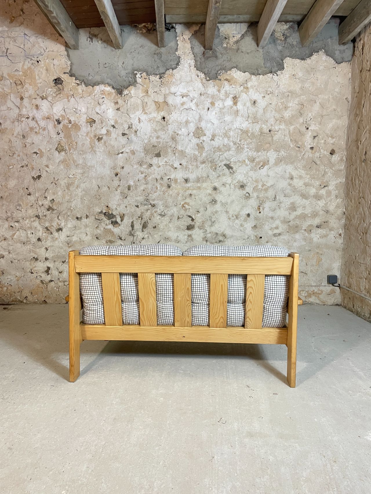 Banquette deux places en pin année 70-80 provenance Allemagne. Très confortables et moelleux, les coussins d’origine ont été lavés et sont en très bon état. On adore le motif quadrillé du tissu! Bonne taille pour un petit salon ou pour coin cosy dans une chambre à couché ! Est également disponible en boutique, le fauteuil assorti !