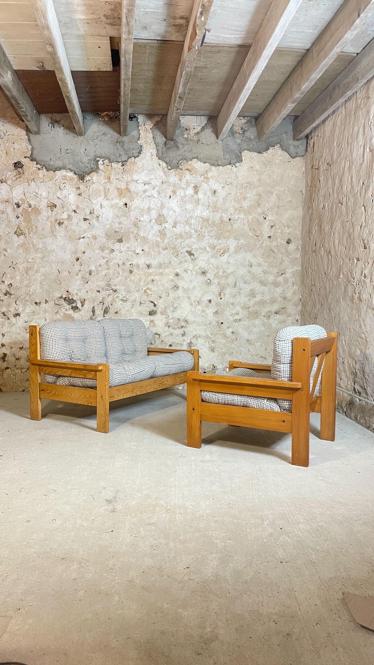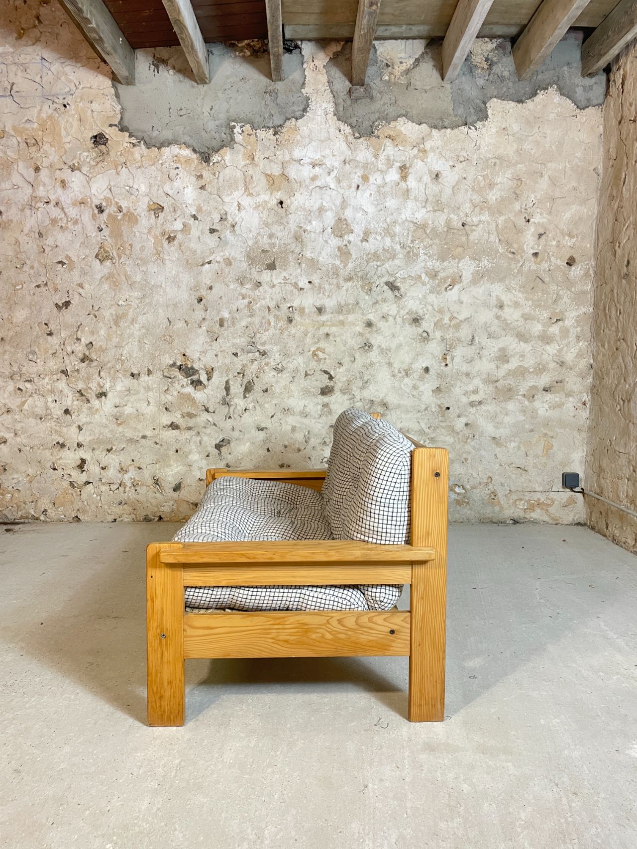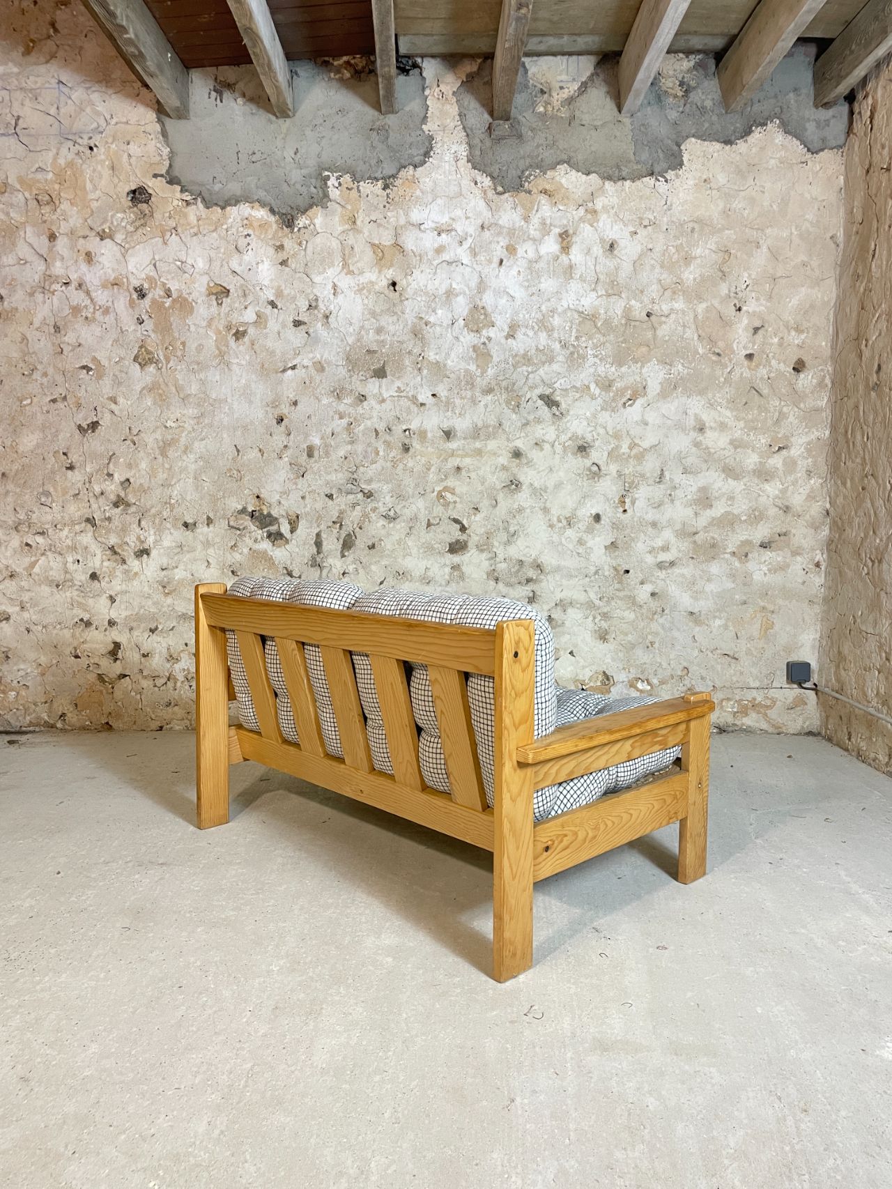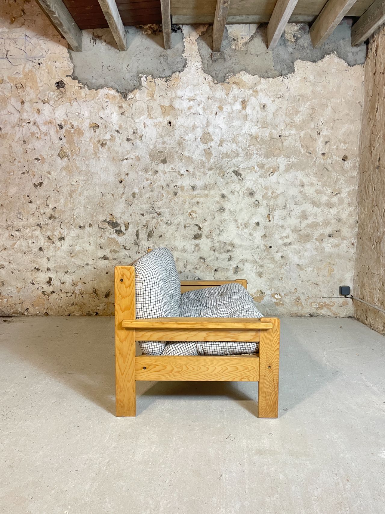 Banquette deux places en pin année 70-80 provenance Allemagne. Très confortables et moelleux, les coussins d’origine ont été lavés et sont en très bon état. On adore le motif quadrillé du tissu! Bonne taille pour un petit salon ou pour coin cosy dans une chambre à couché ! Est également disponible en boutique, le fauteuil assorti !
