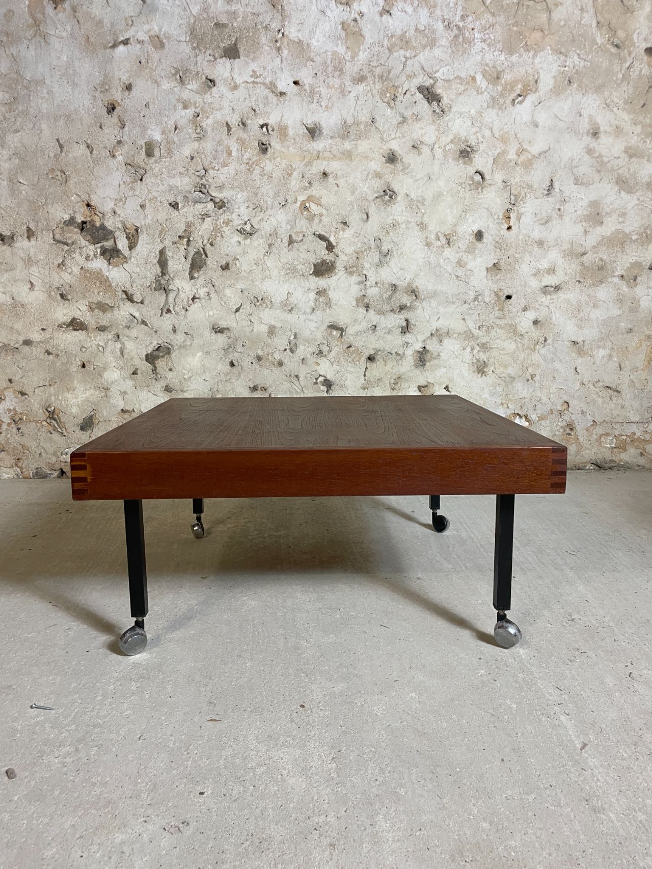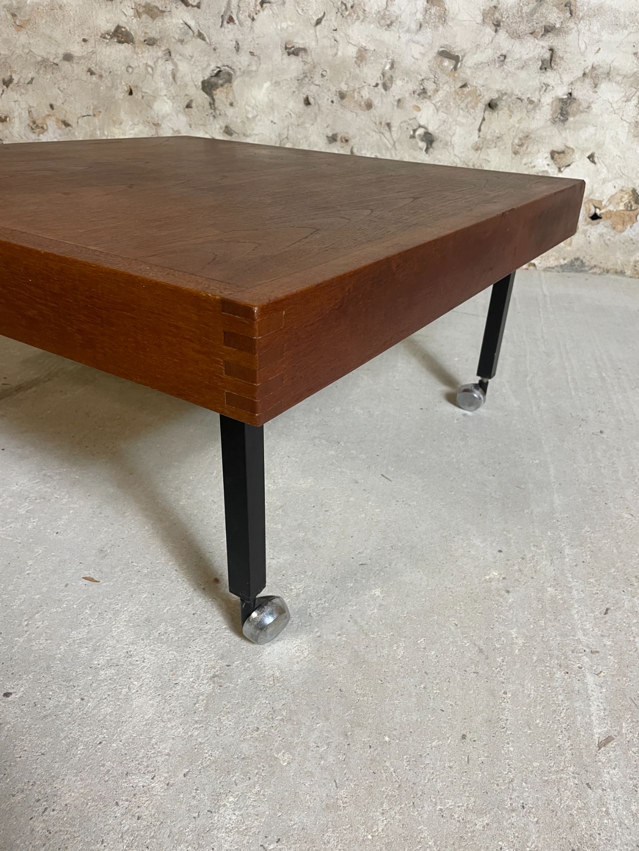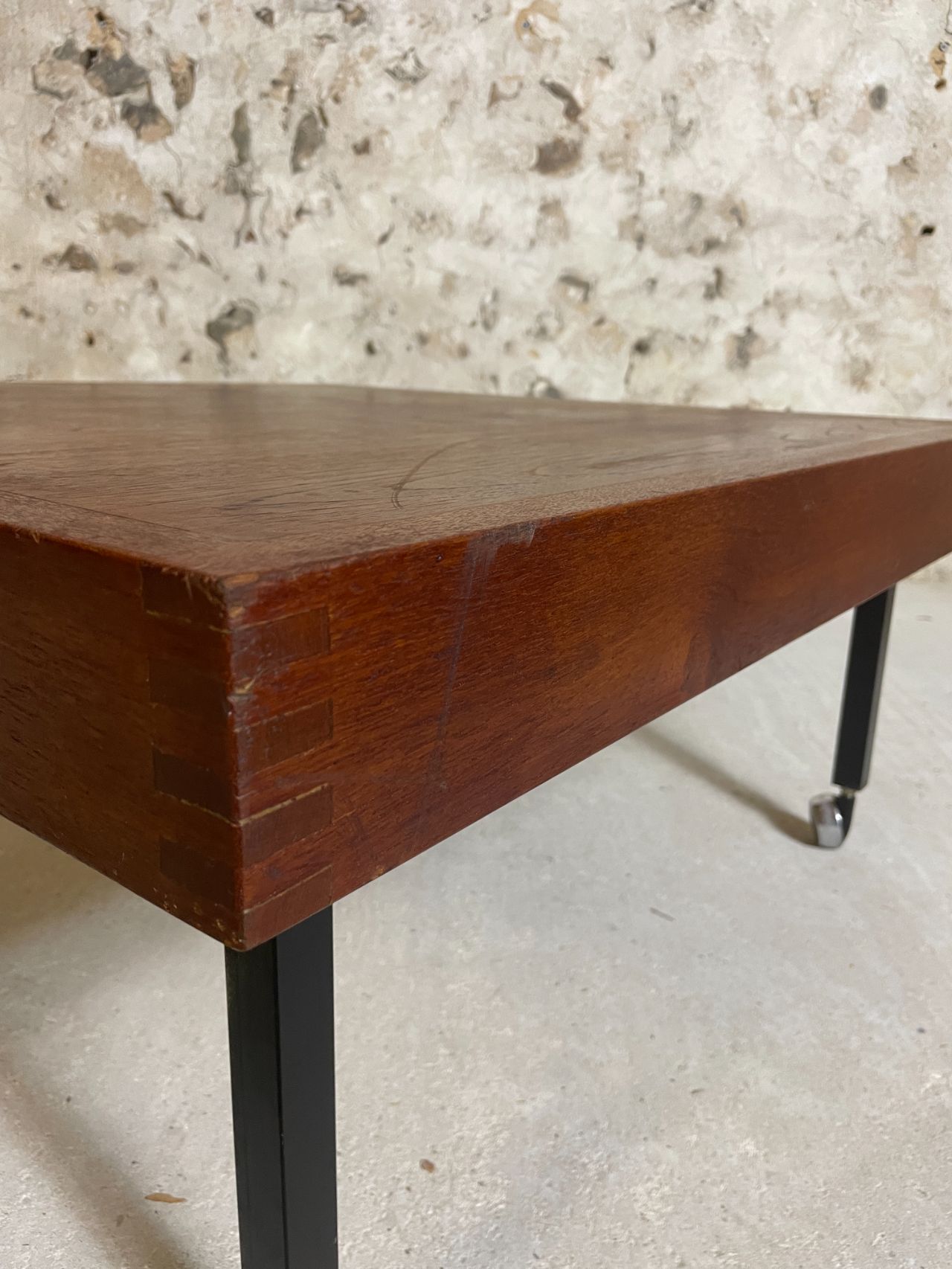 Table basse vintage en teck, assemblage en queue d’aronde. Elle est montée sur roulettes avec piètement en métal noir. Une pièce au design sobre et fonctionnel, idéale pour un intérieur au style industriel ou mid-century. Très bel état, traces d’usures conforme à l’âge et à l’usage, voir photos