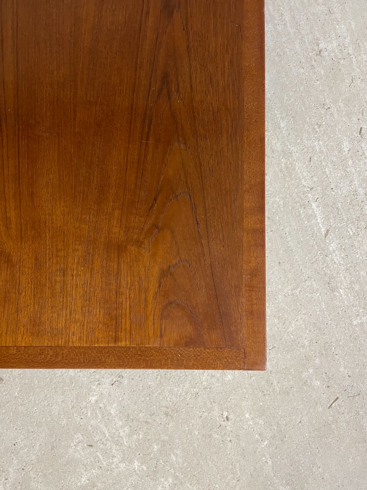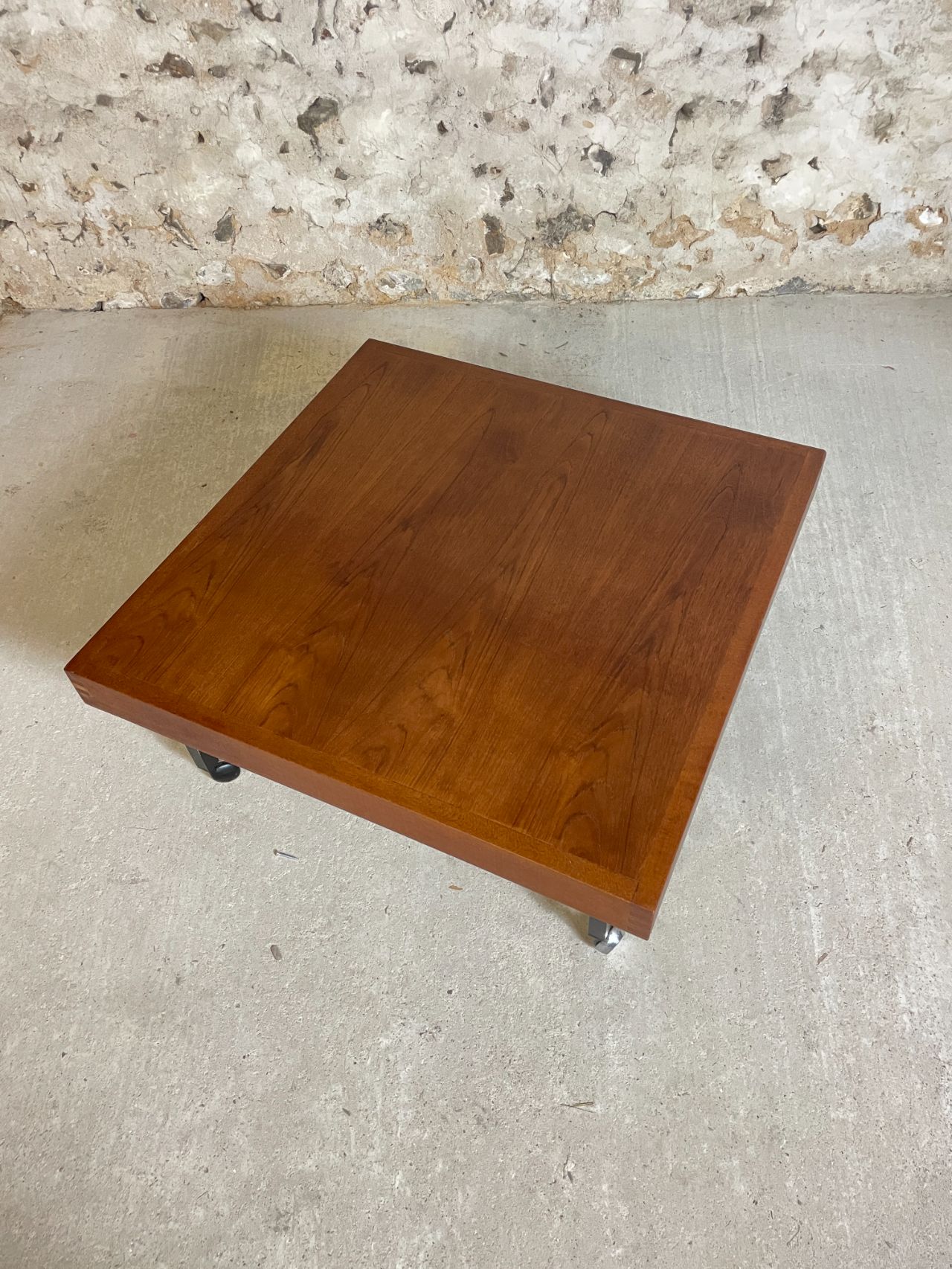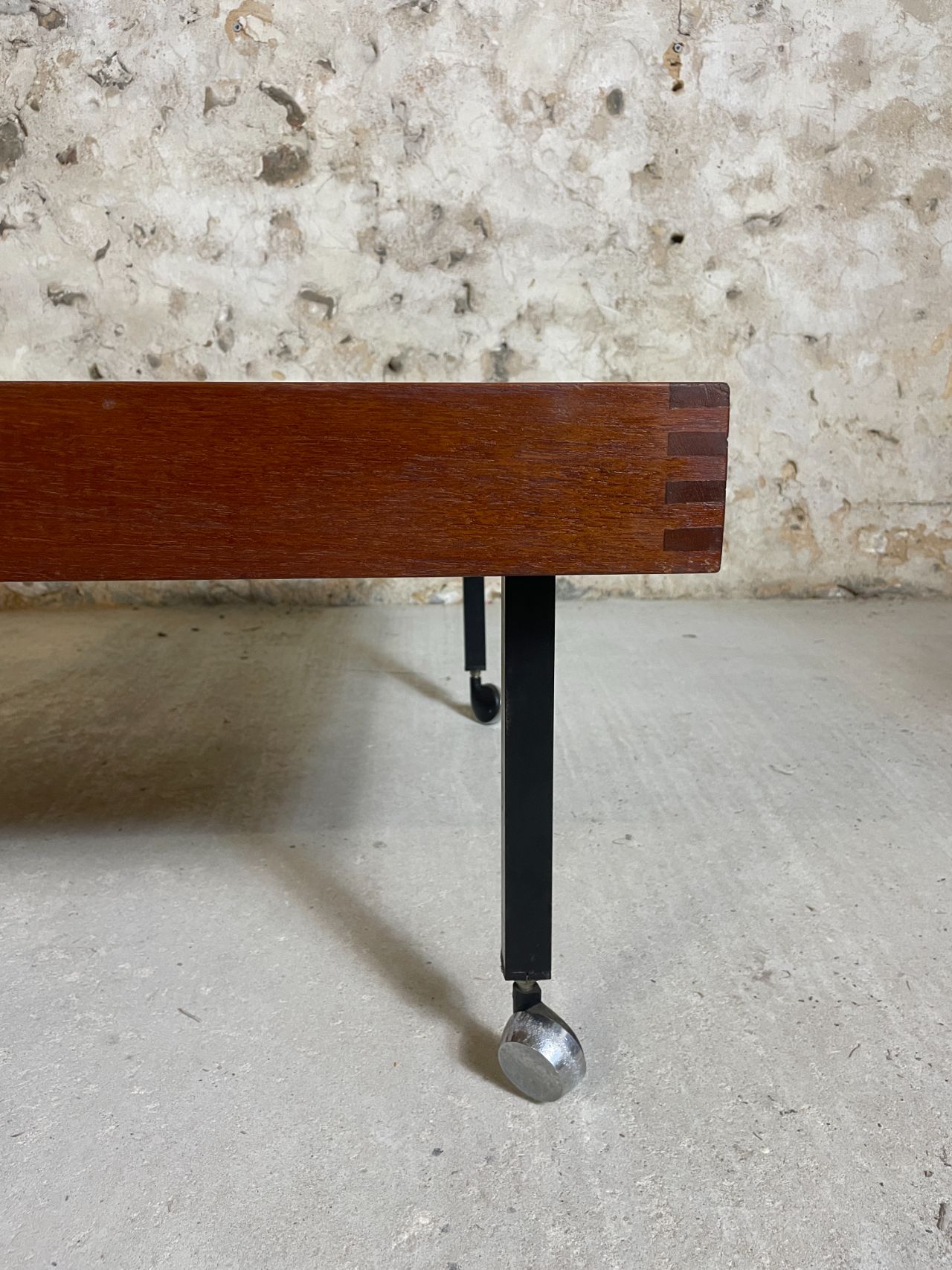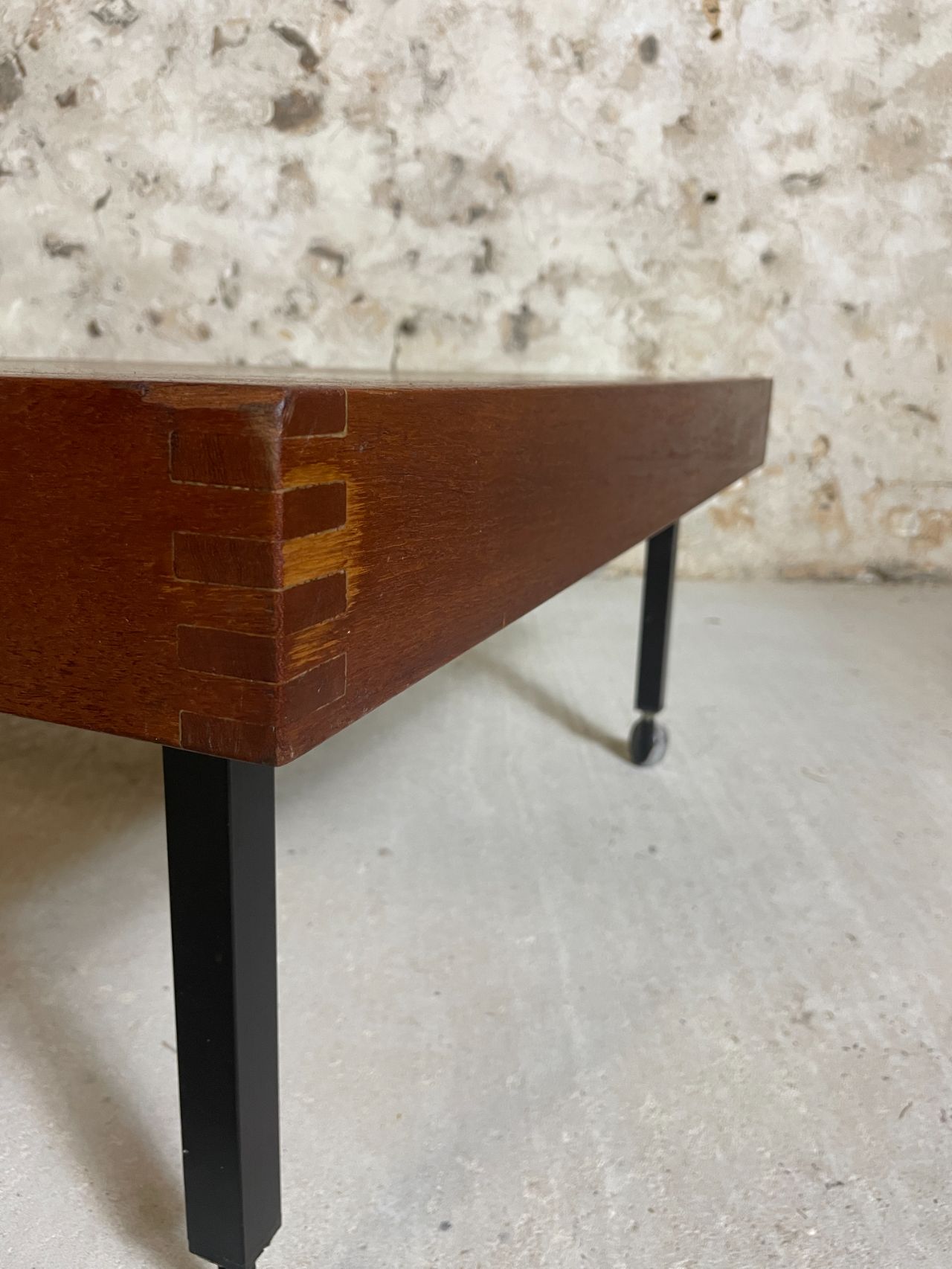 Table basse vintage en teck, assemblage en queue d’aronde. Elle est montée sur roulettes avec piètement en métal noir. Une pièce au design sobre et fonctionnel, idéale pour un intérieur au style industriel ou mid-century. Très bel état, traces d’usures conforme à l’âge et à l’usage, voir photos