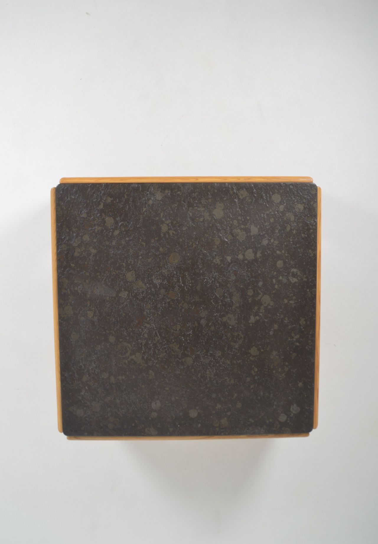 This table has a beautiful geometrically shaped wooden frame with a rounded natural stone top.
