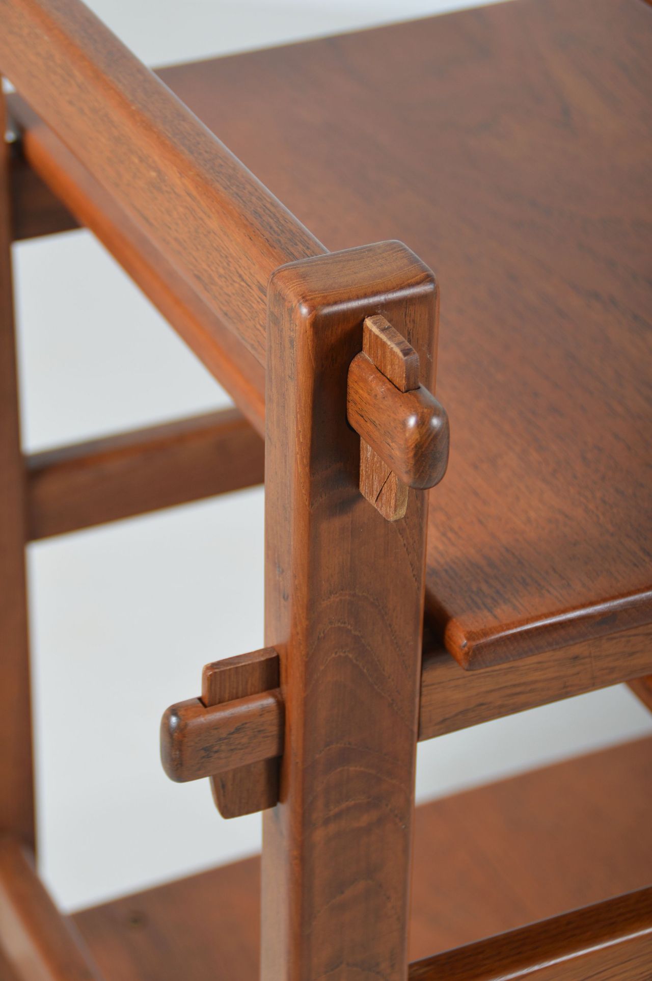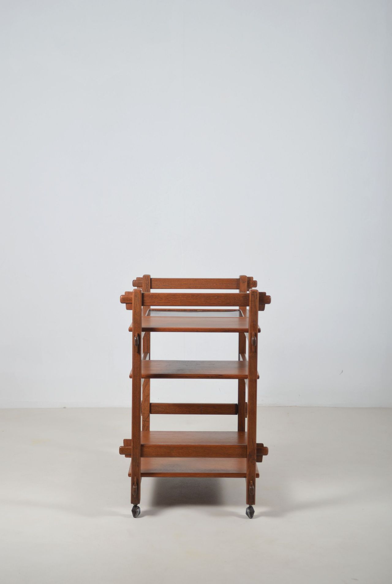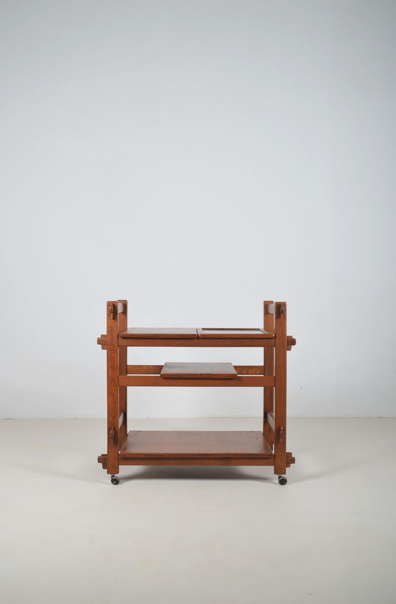 Brutalist serving trolley from the 1970s with interchangeable trays. The trolley features beautiful wood grain and intricate joinery that are integral to the design.