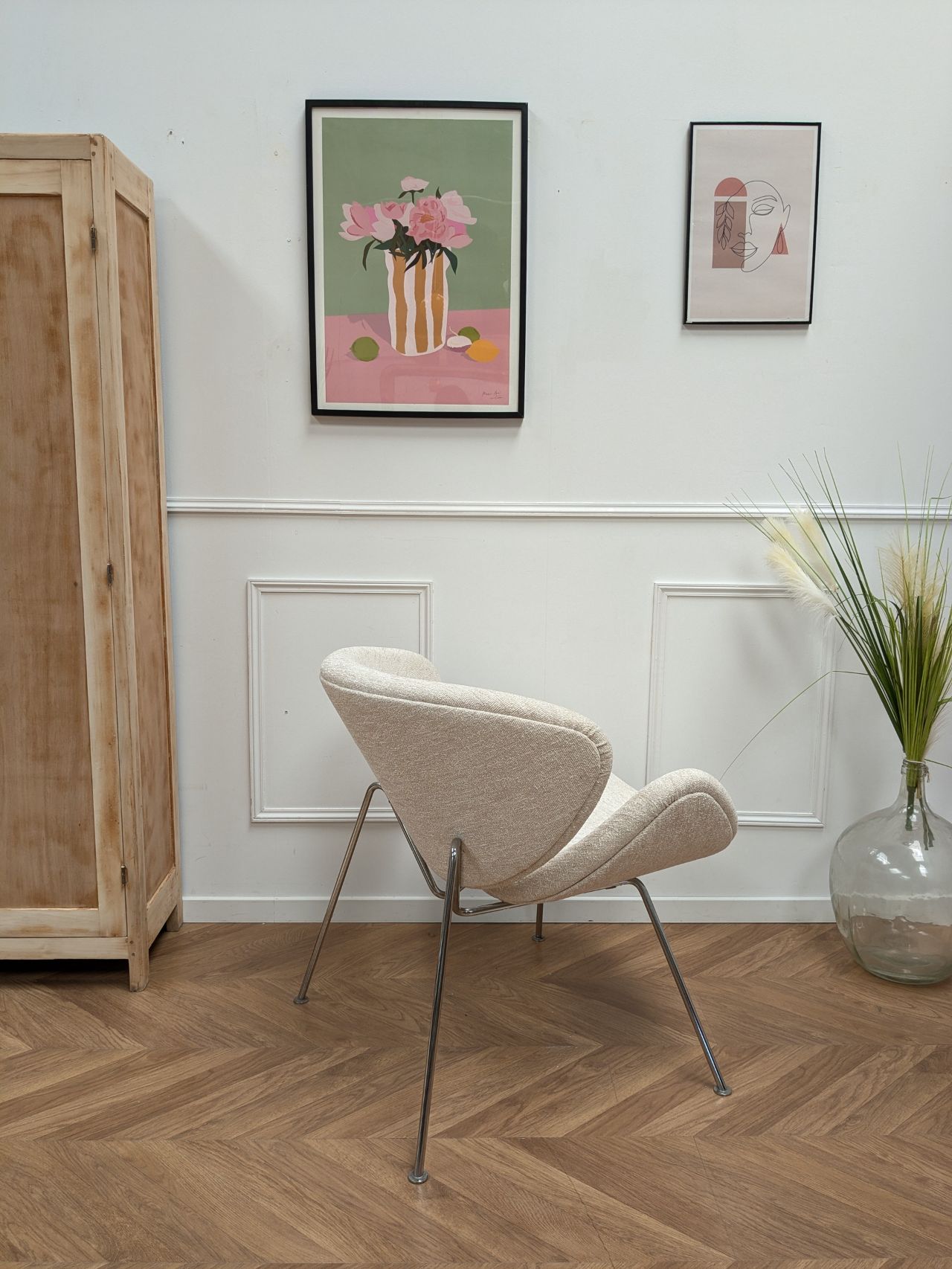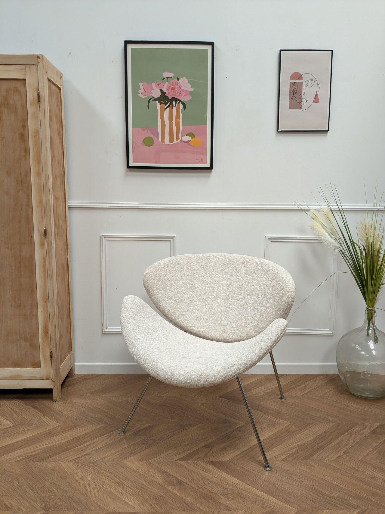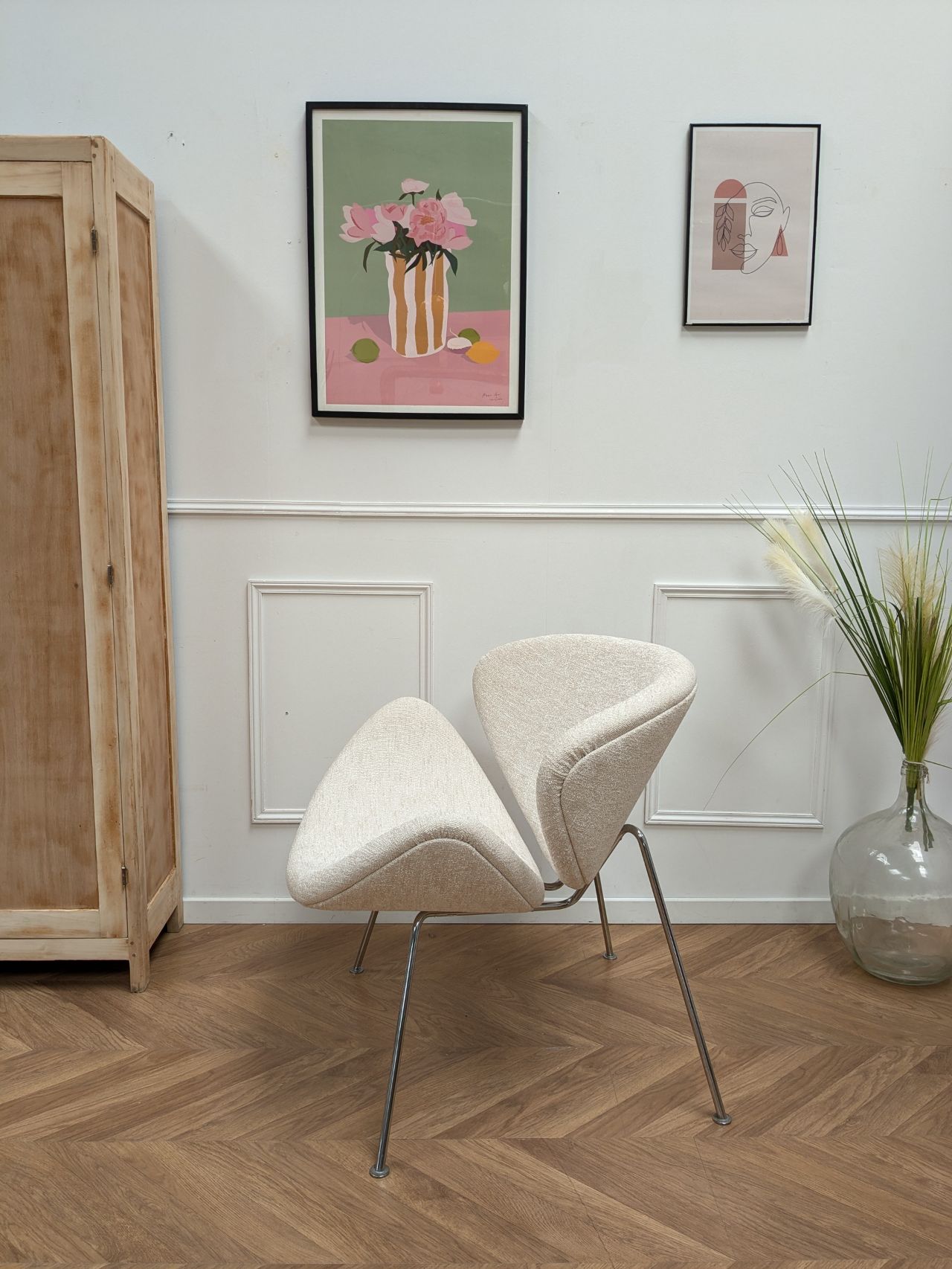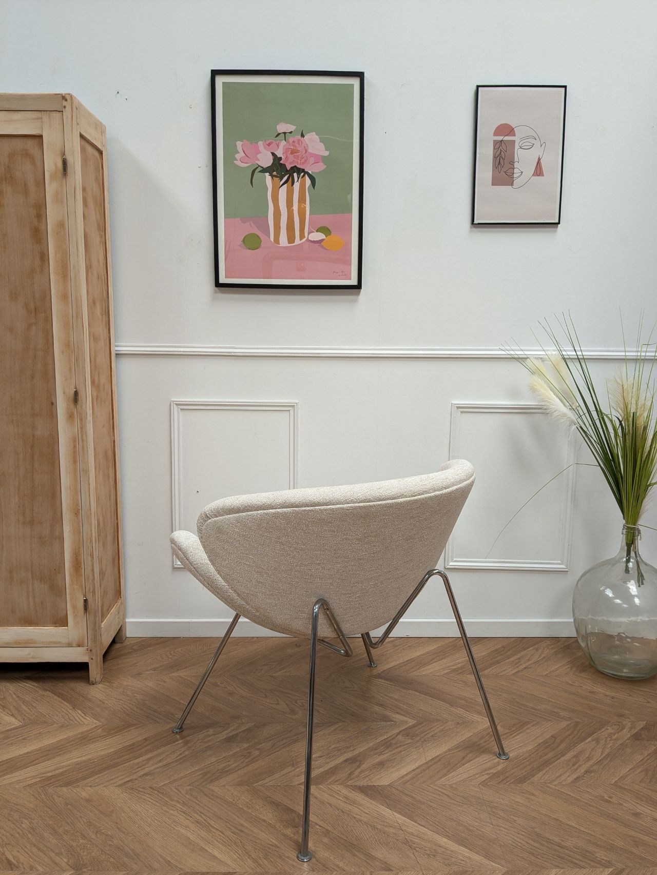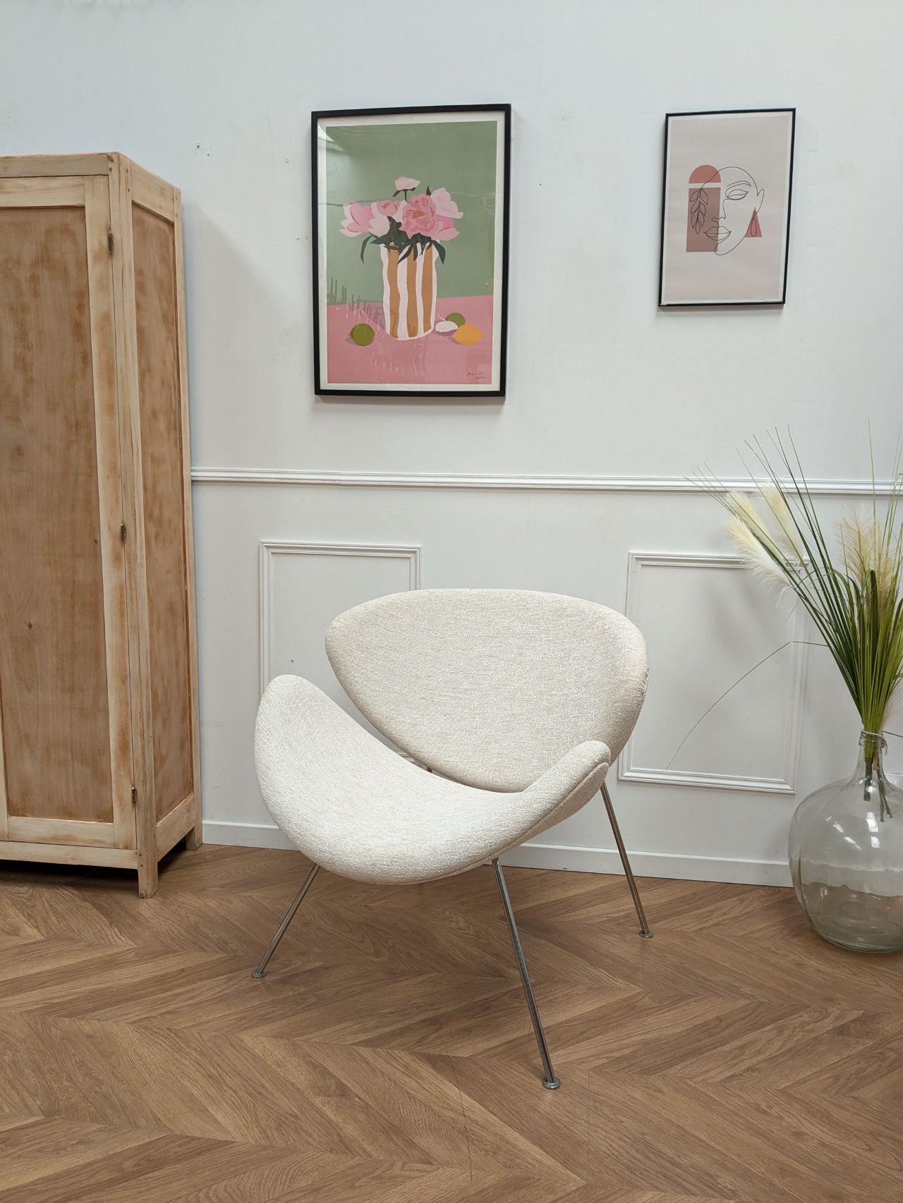 Le fauteuil Orange Slice, conçu par Pierre Paulin en 1957, est une pièce emblématique du design français. Édité par Artifort, ce modèle se distingue par sa structure interne en hêtre pressé, enveloppée dans une mousse moulée.