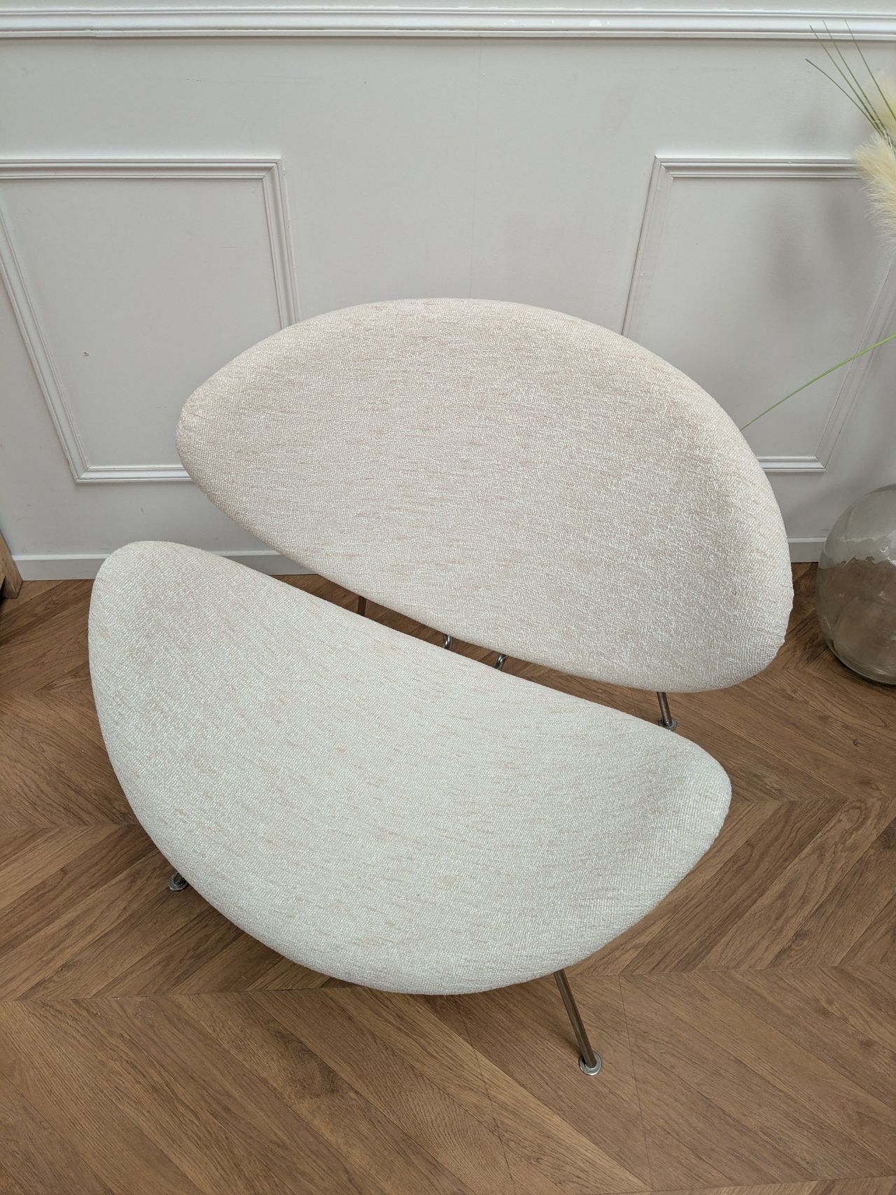 Retapissé par l'atelier, il arbore une élégante couleur crème. Ce fauteuil, d'origine française, incarne l'esthétique et le savoir-faire de son époque, tout en offrant un confort moderne.