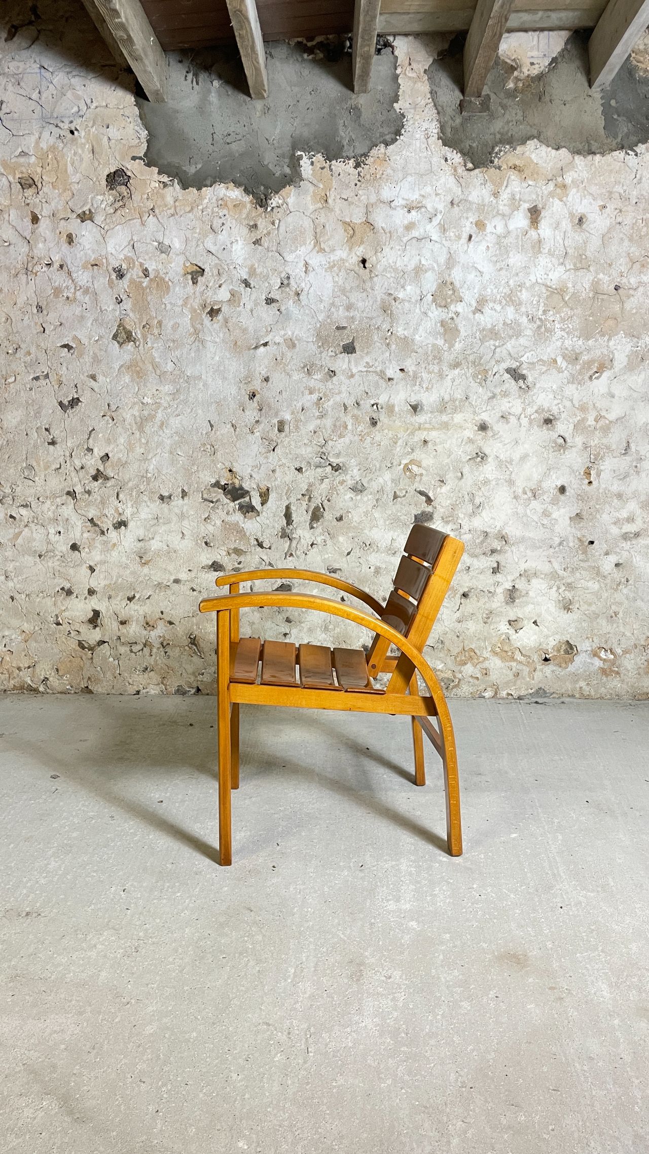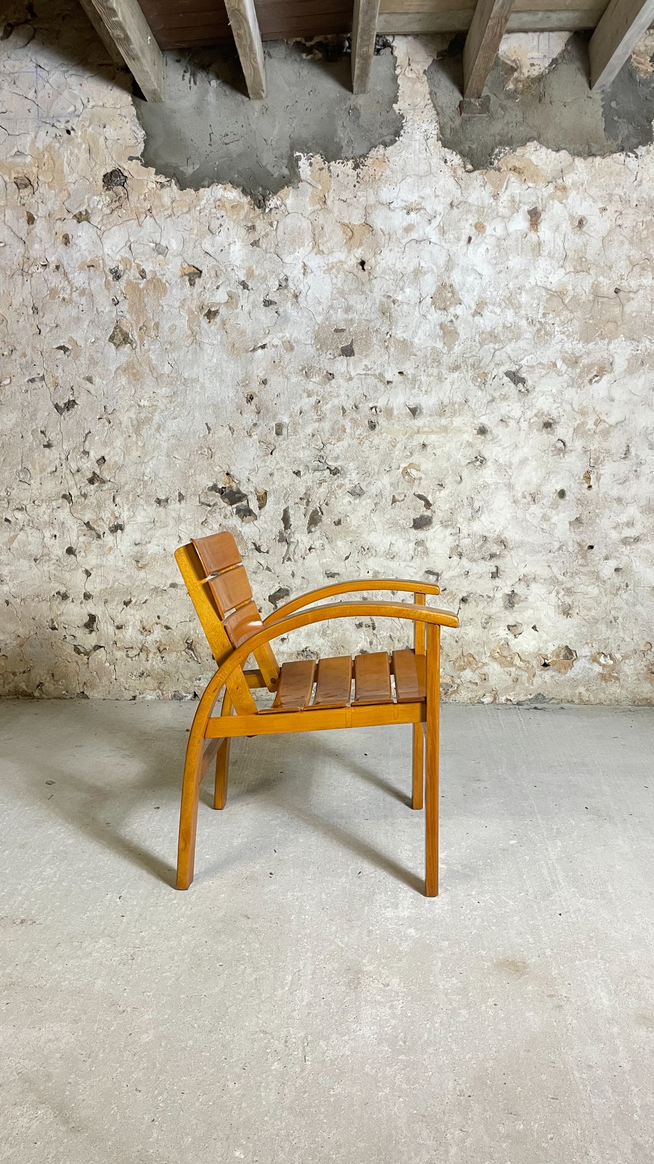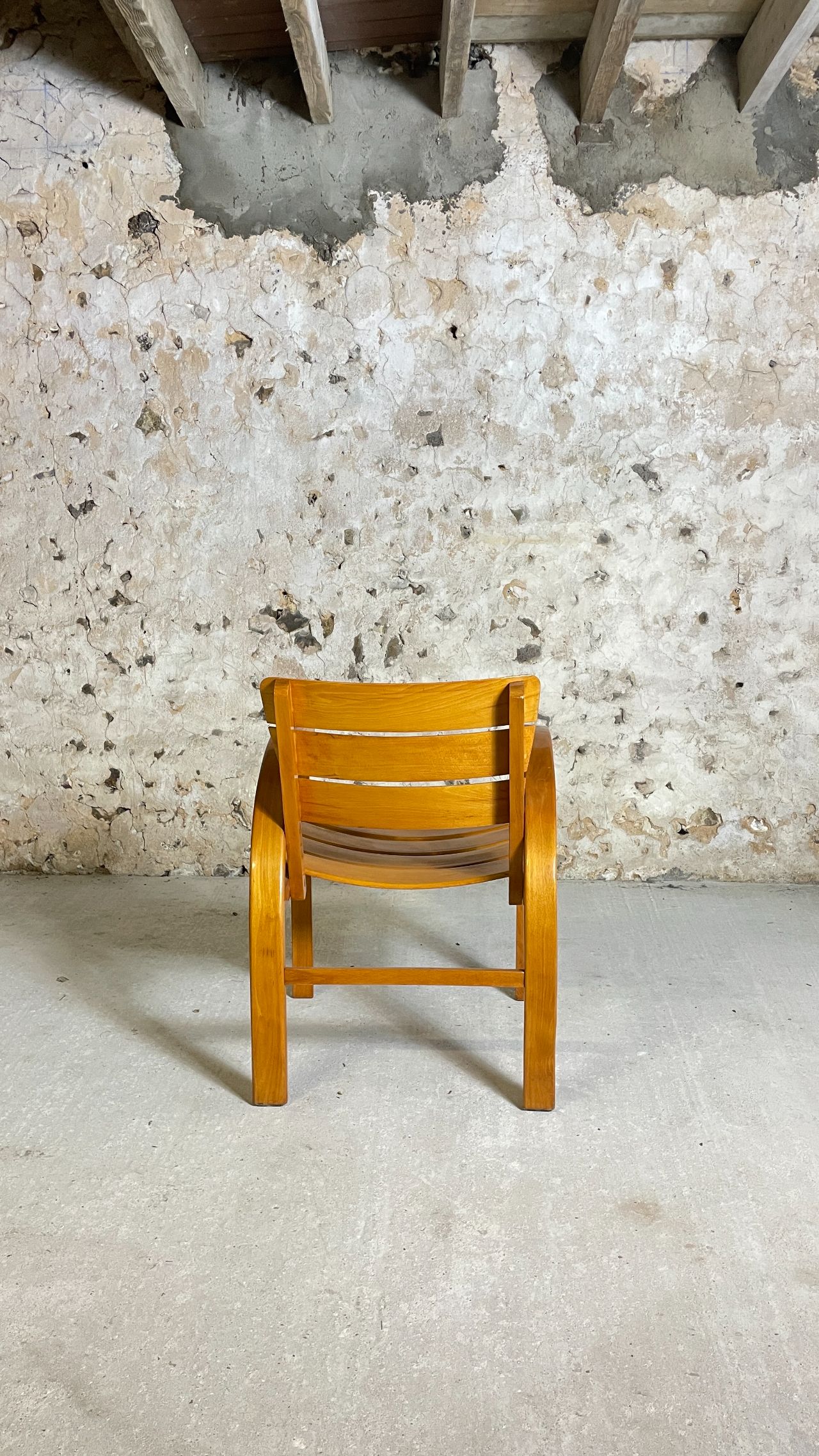 Paire de fauteuils en hêtre, provenance Allemagne, années 60-70. Superbe ligne des accoudoirs, ils sont très graphique et trouveront facilement leur place dans n’importe quel salon. Ils sont en parfait état. DIMENSIONS