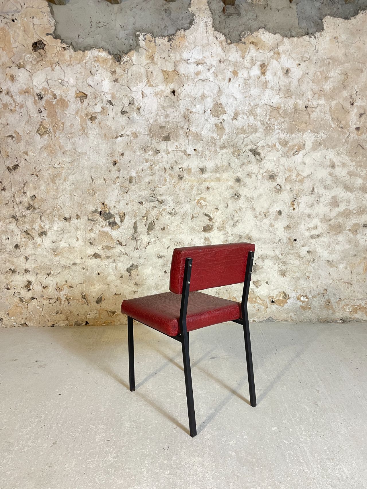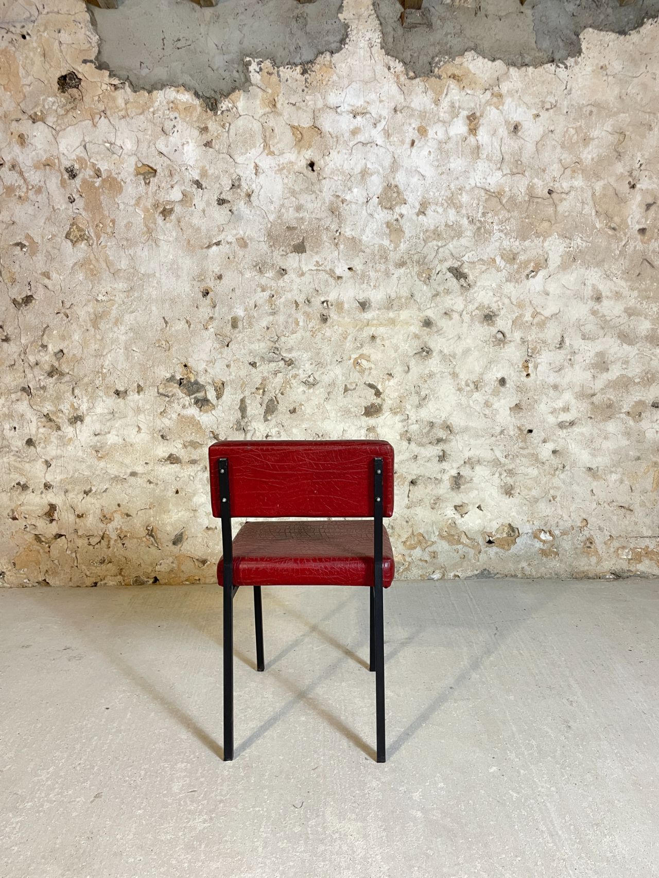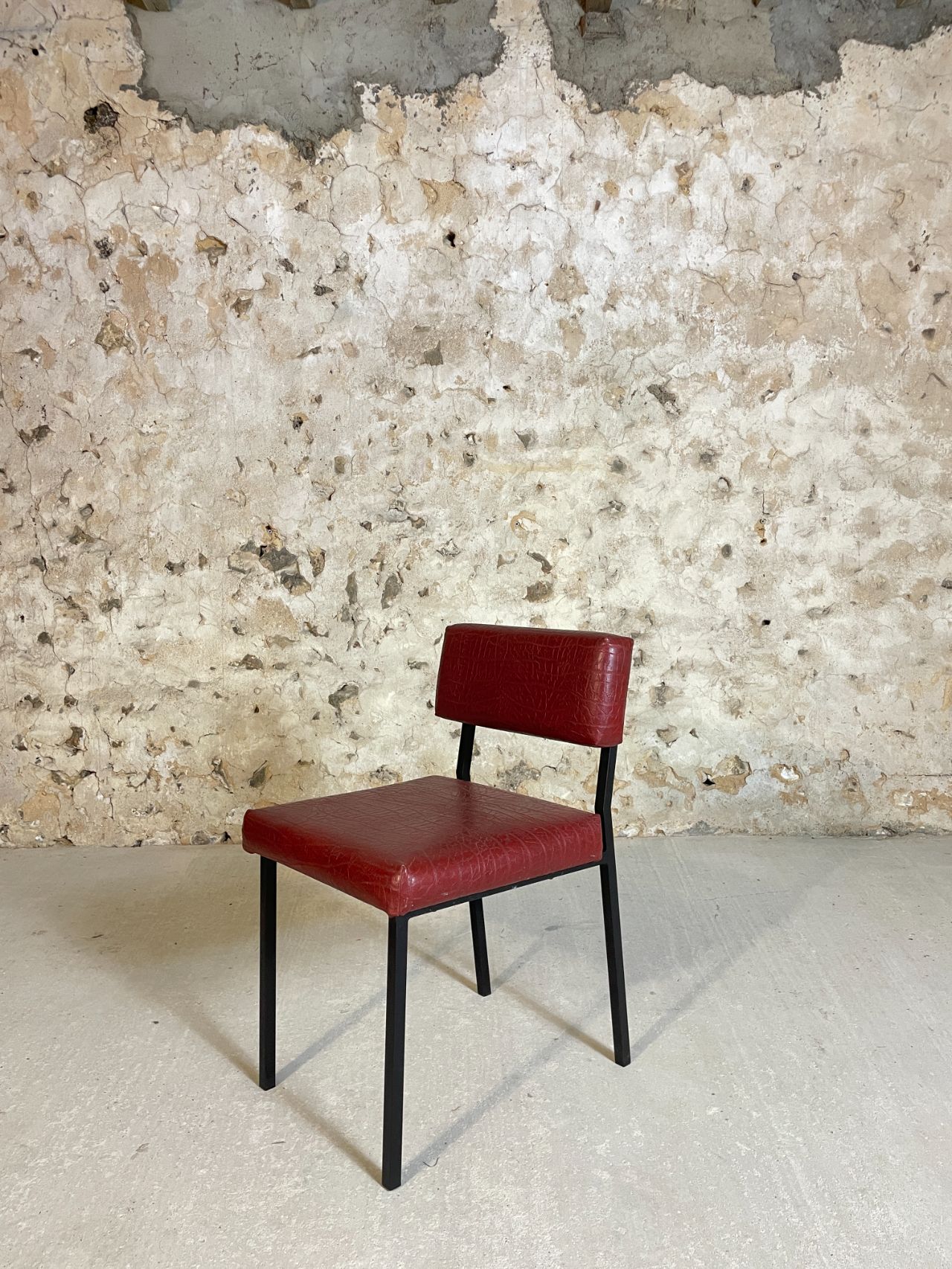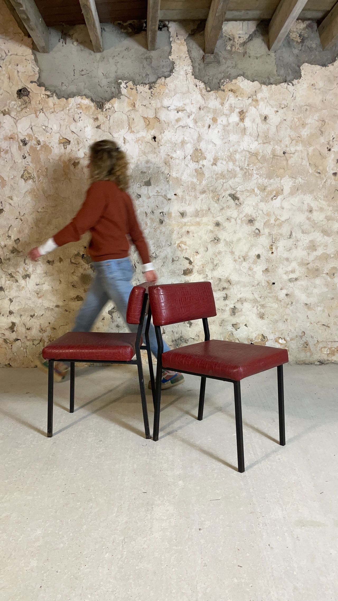 Chaises au look rétro industrielle avec structure en métal noir et assise/dossier en vinyle rouge effet croco années 50/60. Solides, confortables et pleines de charme, parfaites pour une déco industrielle ou vintage. Bon état d’ensemble le vinyle est impeccable, la structure en métal présente quelques traces du temps, voir photos.