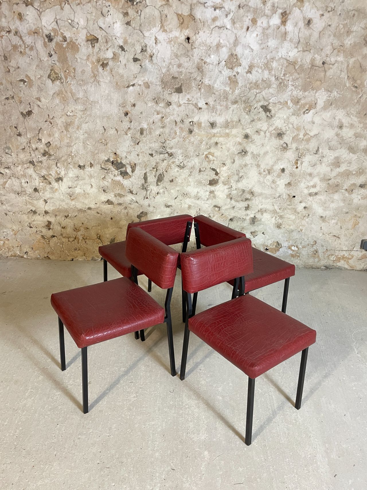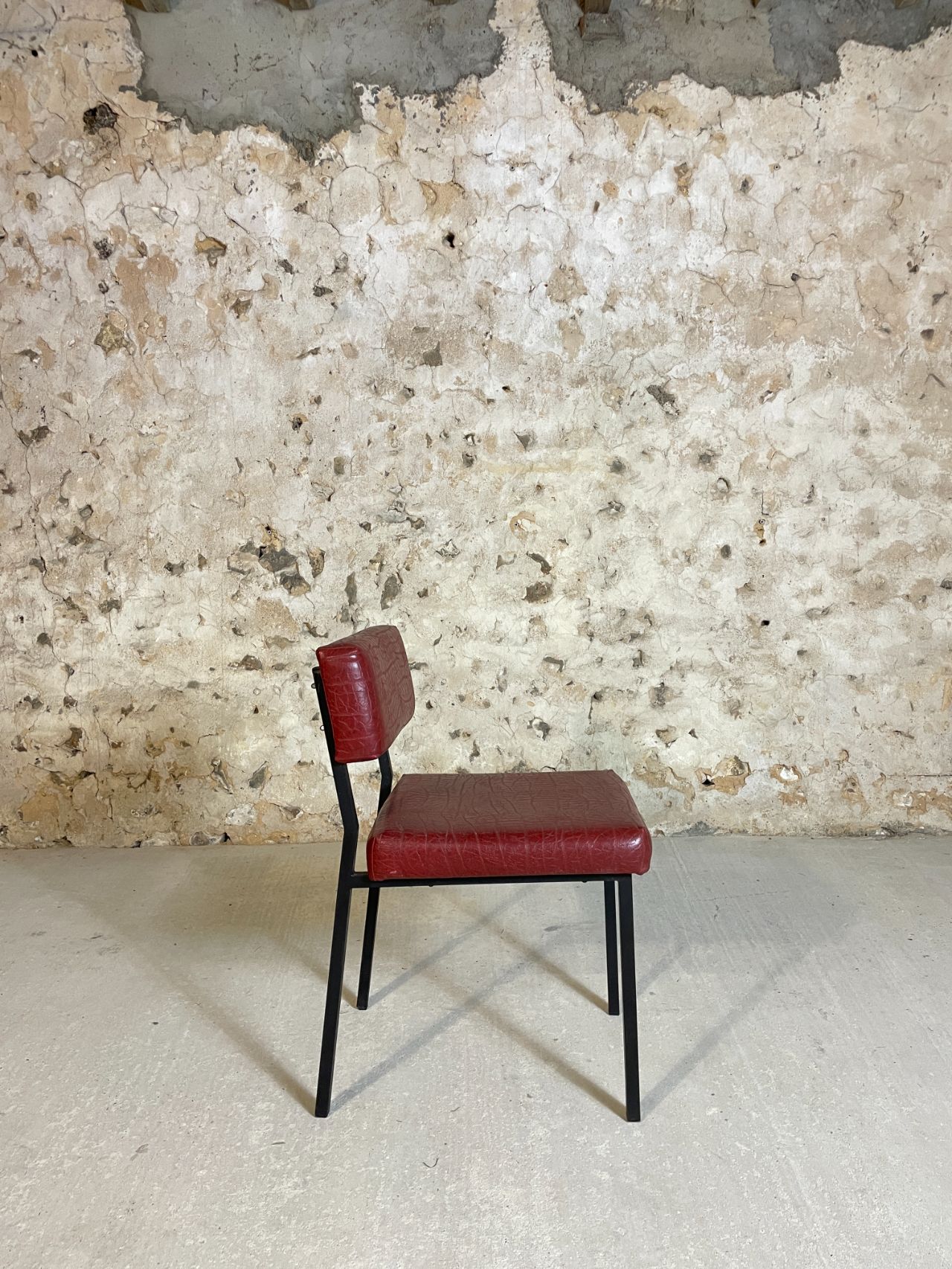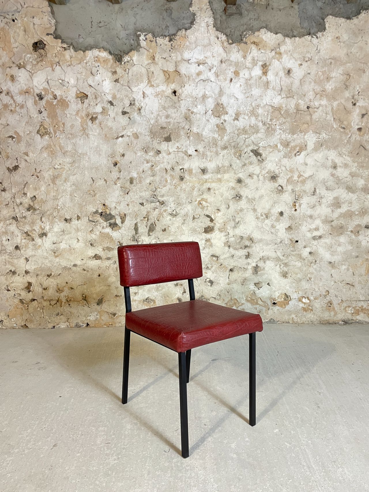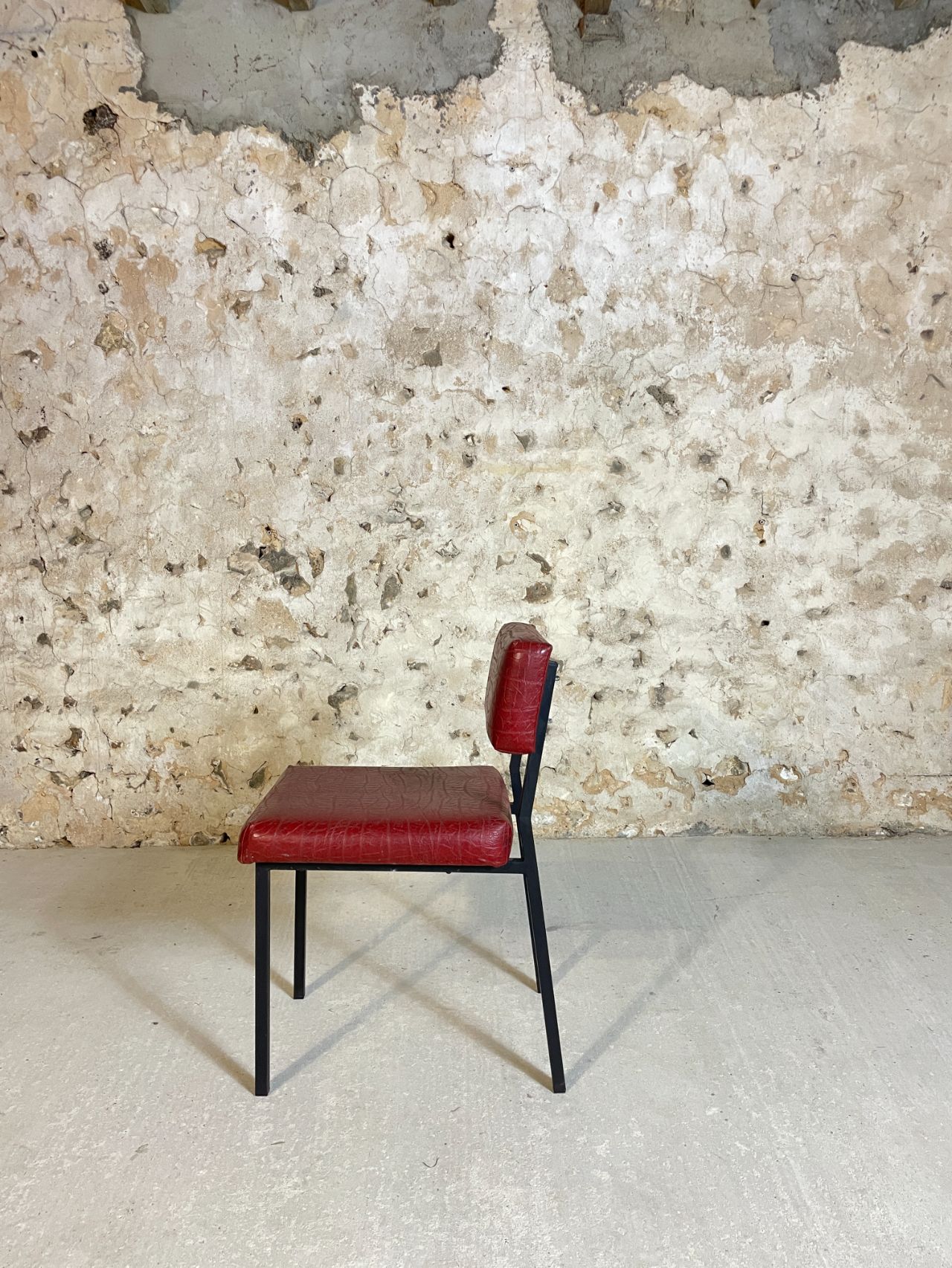 Chaises au look rétro industrielle avec structure en métal noir et assise/dossier en vinyle rouge effet croco années 50/60. Solides, confortables et pleines de charme, parfaites pour une déco industrielle ou vintage. Bon état d’ensemble le vinyle est impeccable, la structure en métal présente quelques traces du temps, voir photos.
