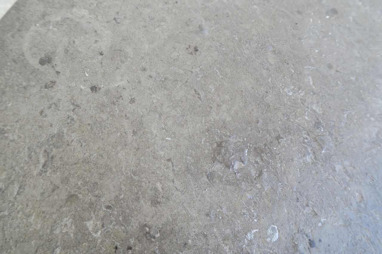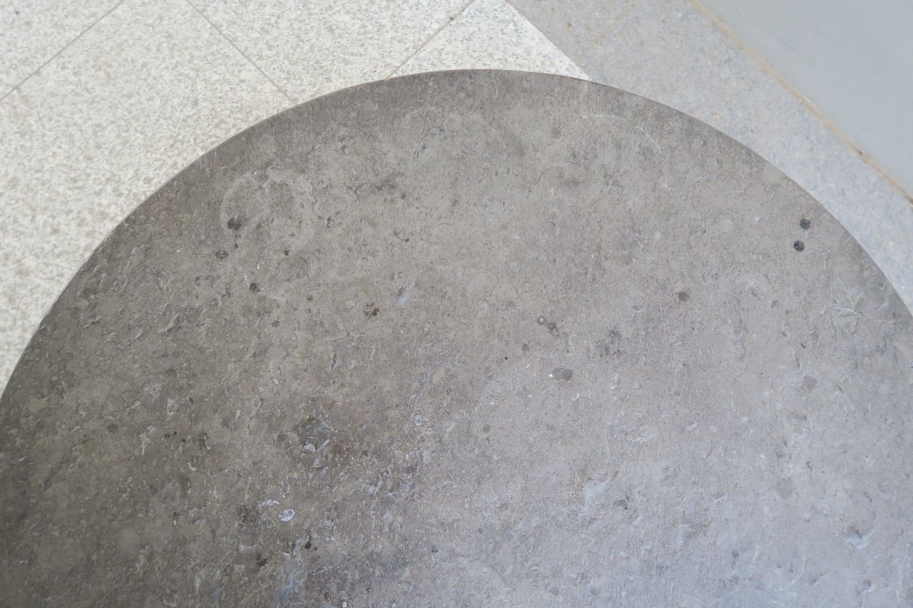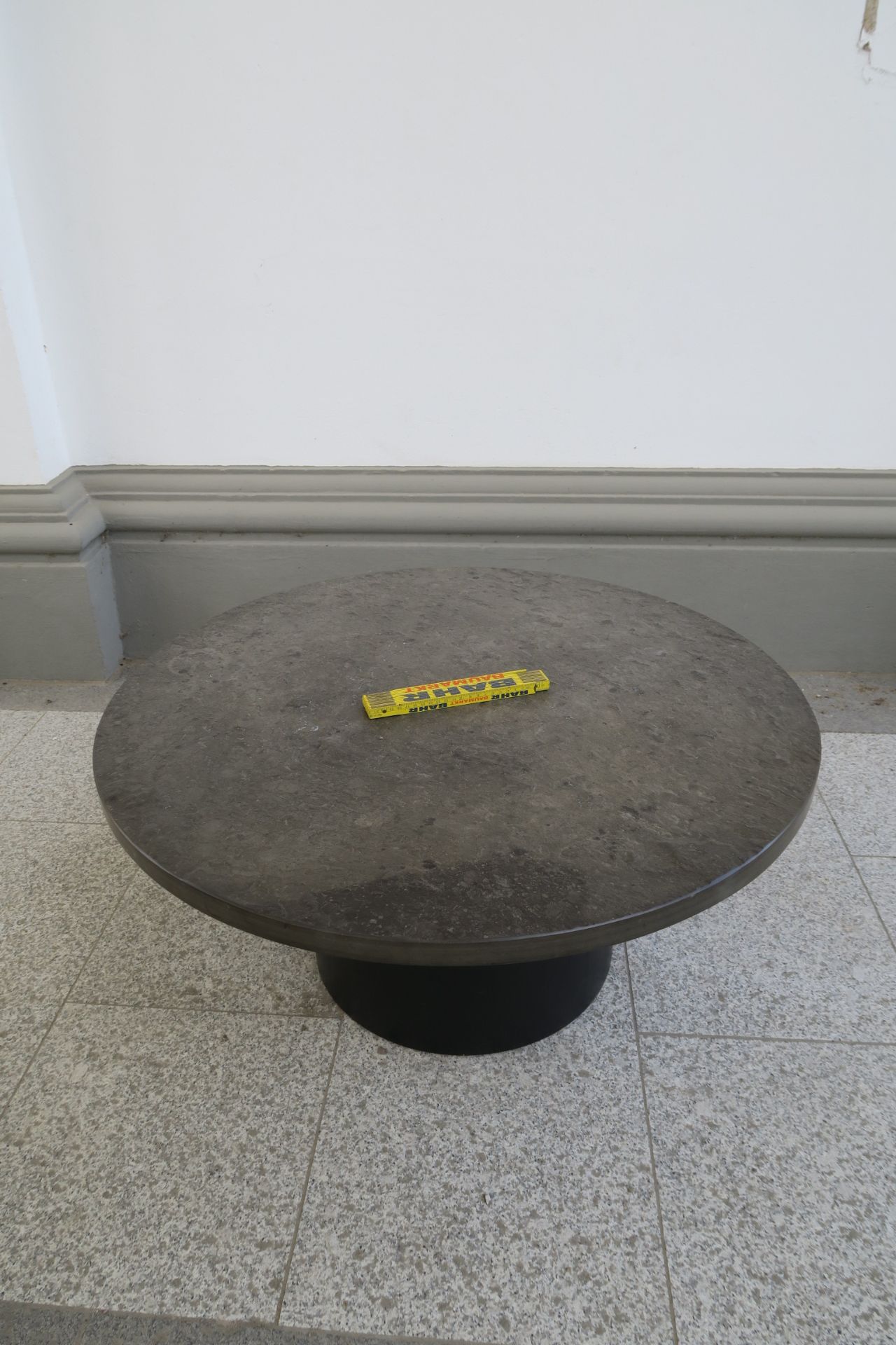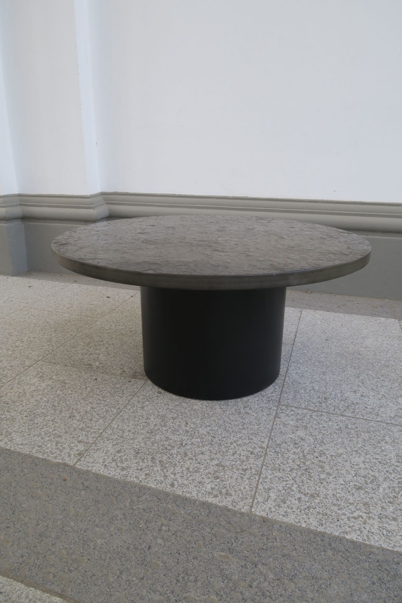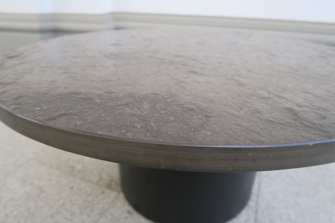 Round couch table with black slade plate by draenert studios