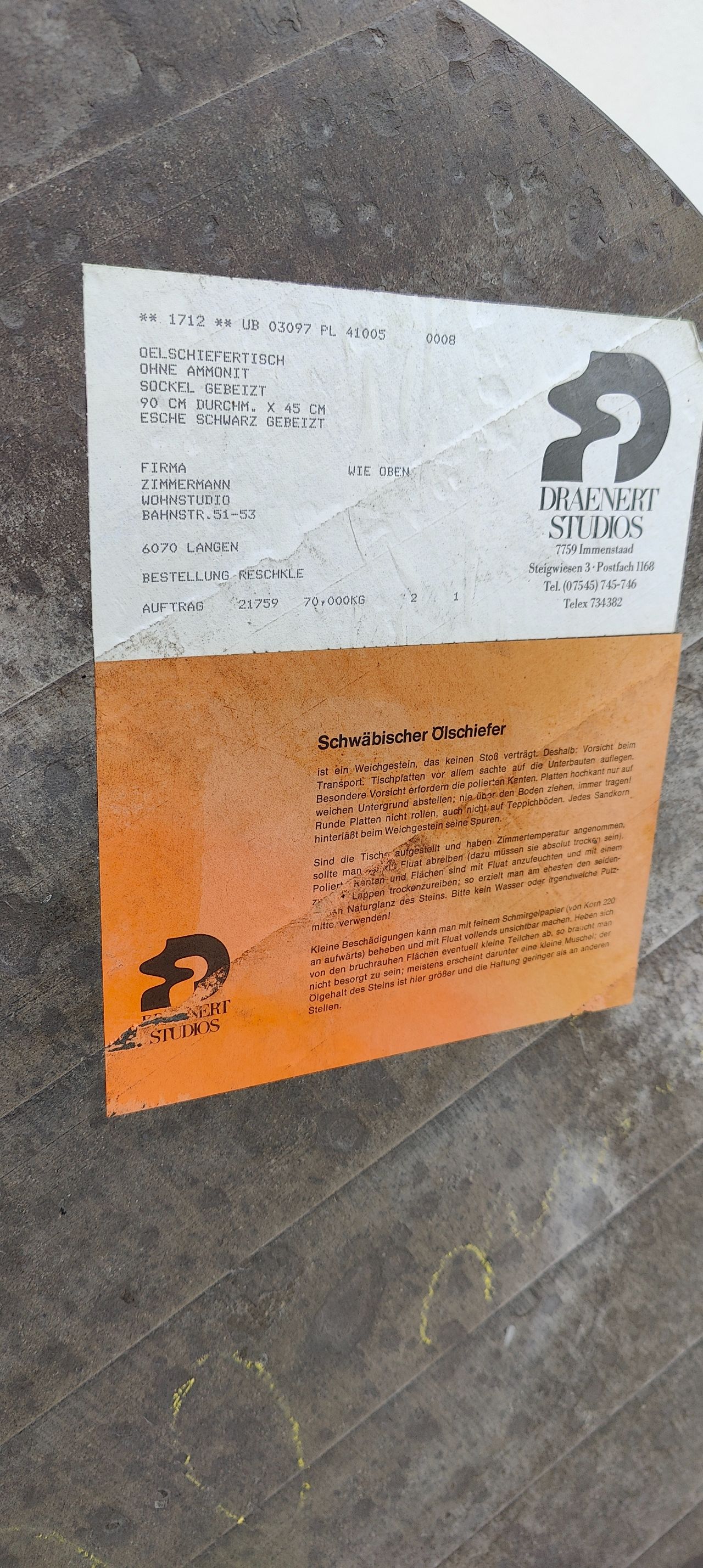 Round couch table with black slade plate by Draenert Studios.