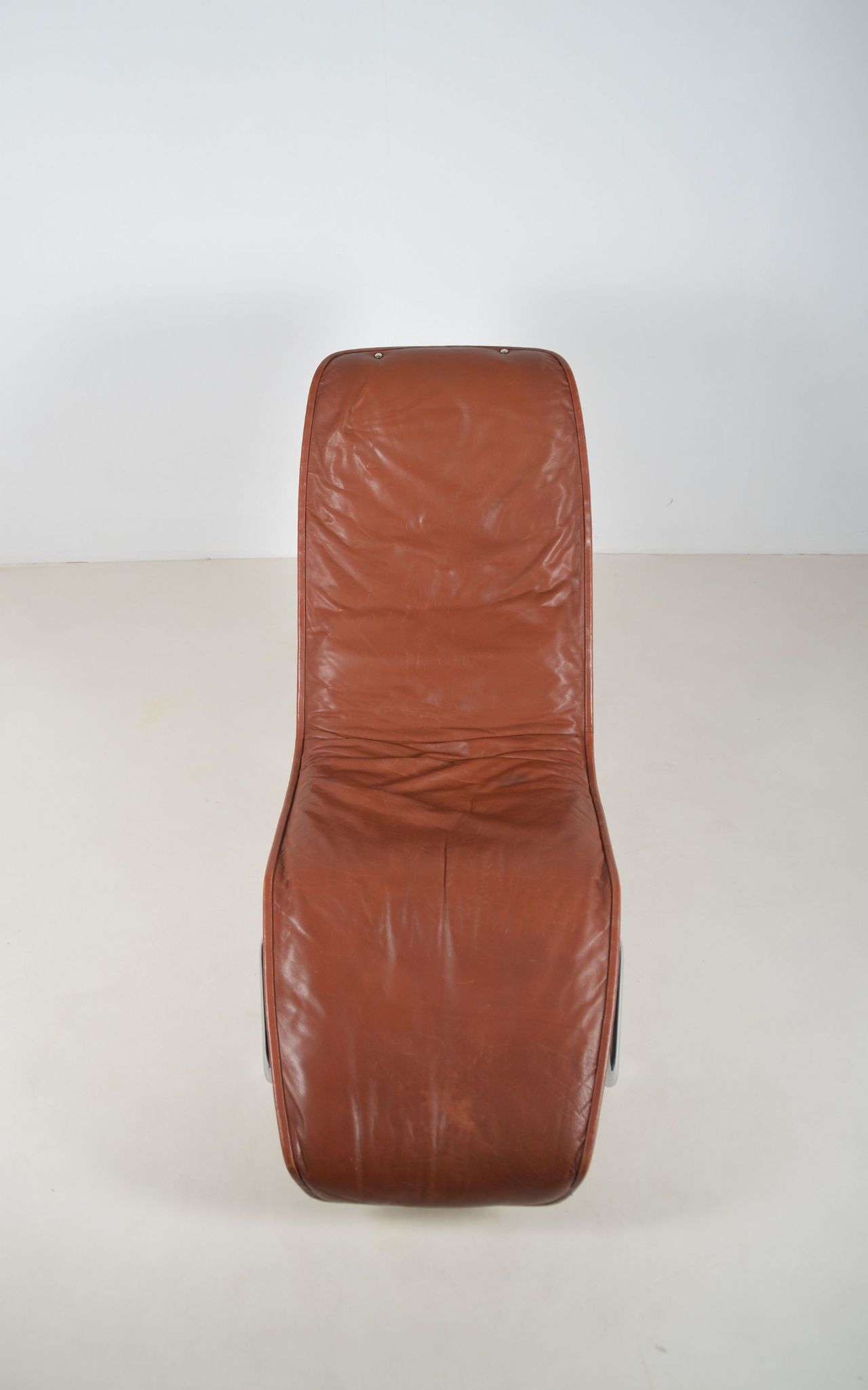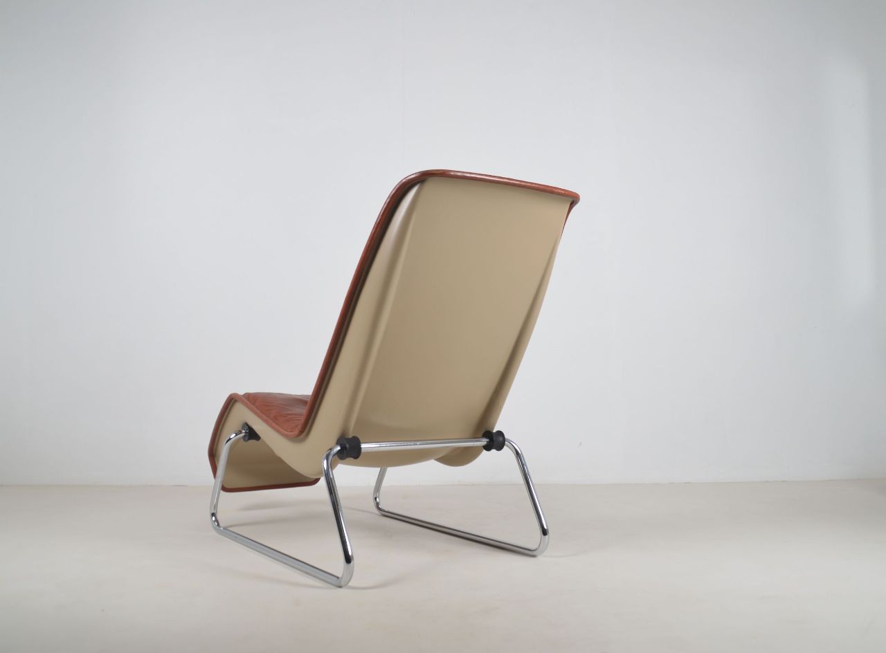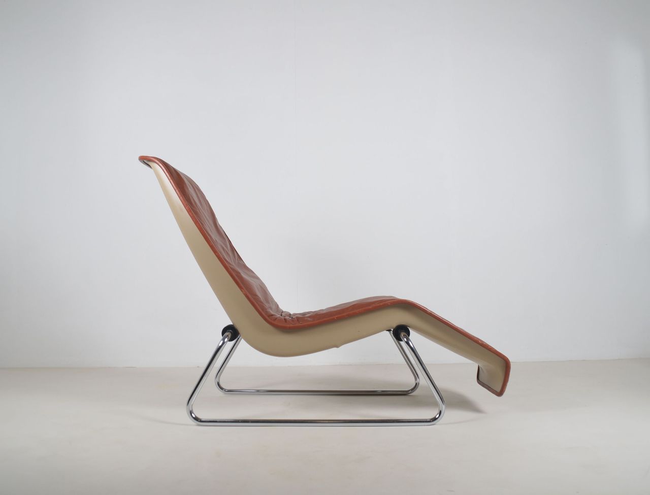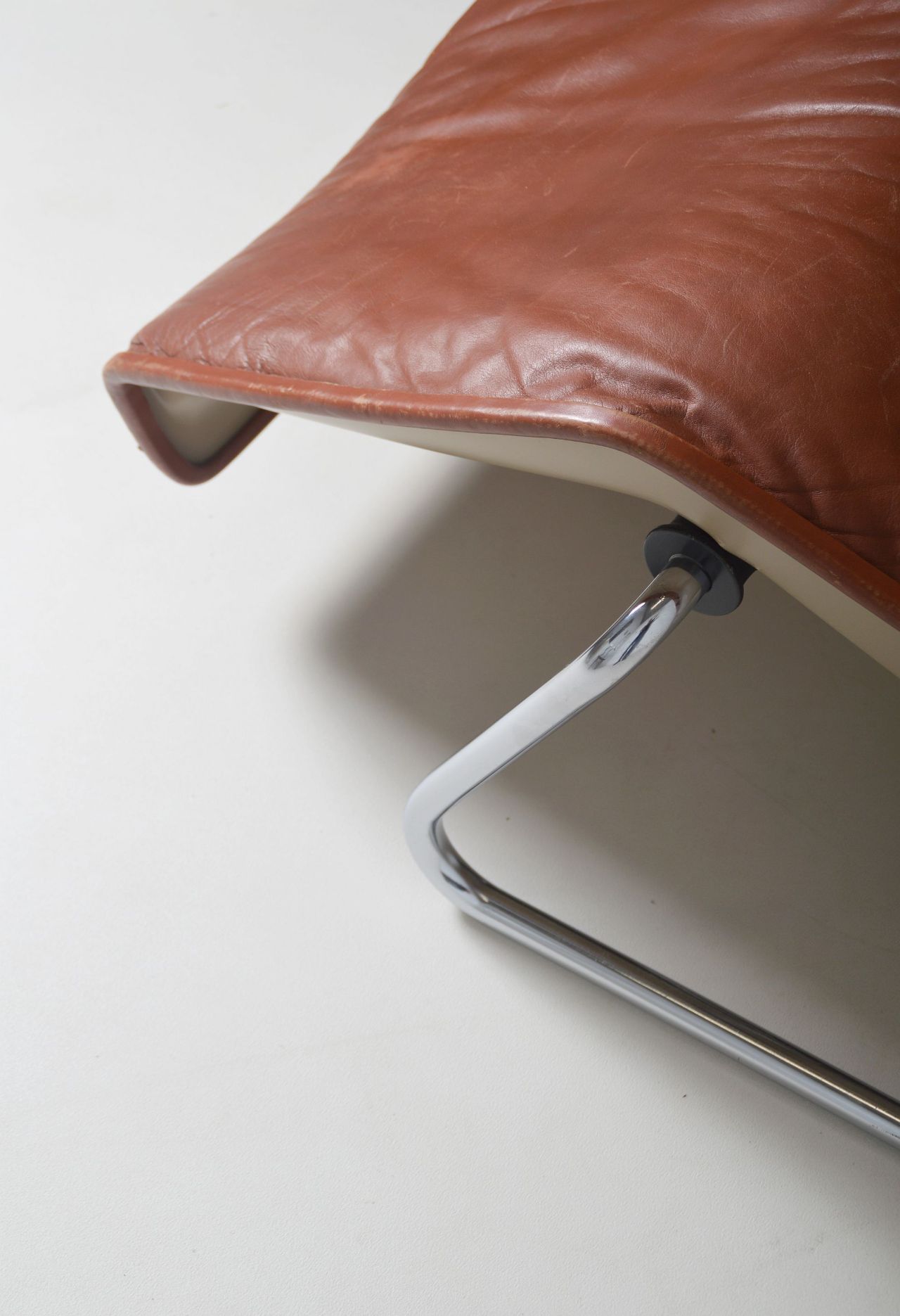 This armchair features a sturdy plastic shell upholstered in cognac-colored leather. The shell rests on a chrome-plated metal base, creating the illusion of weightlessness. It can also be adjusted from a sitting to a reclining position, ensuring optimal comfort.