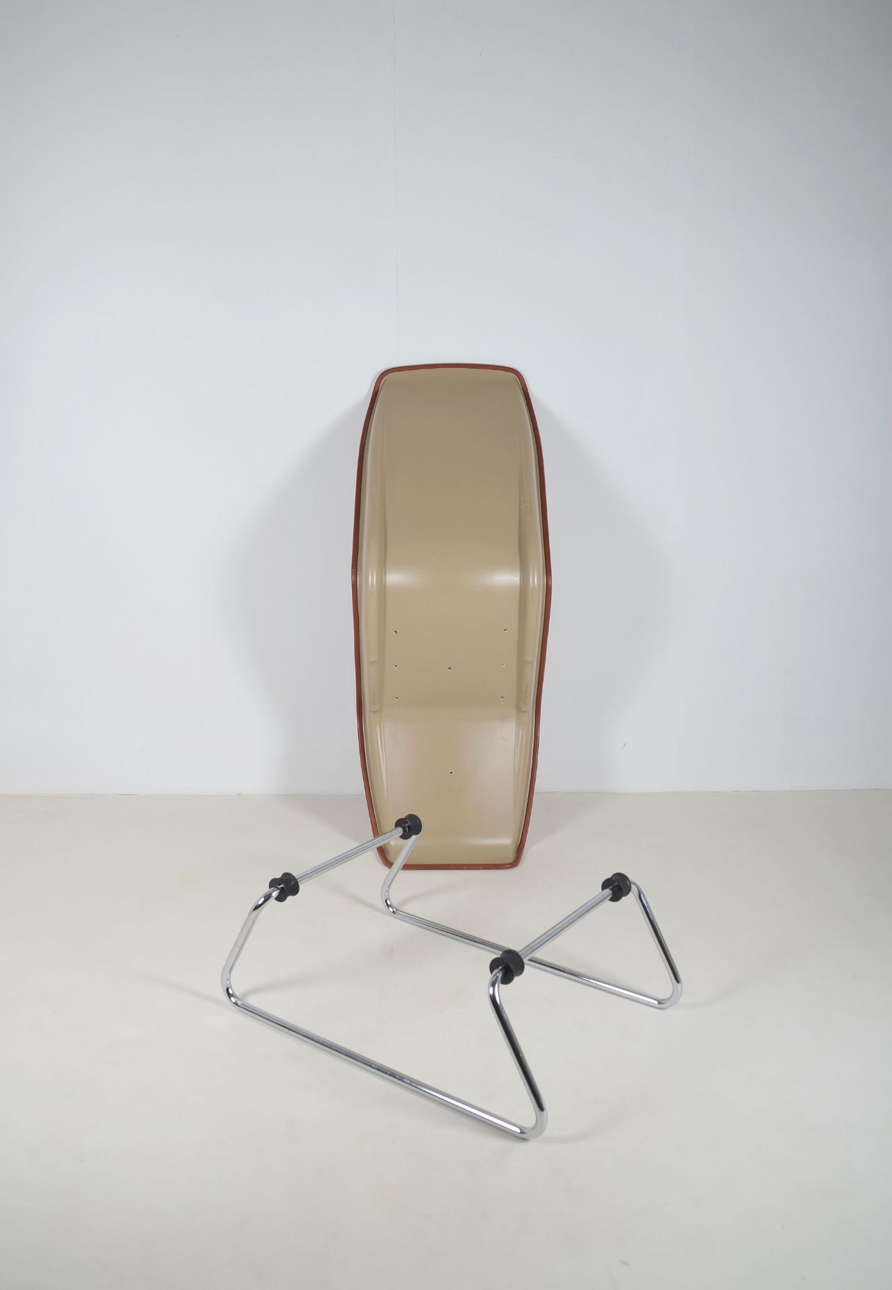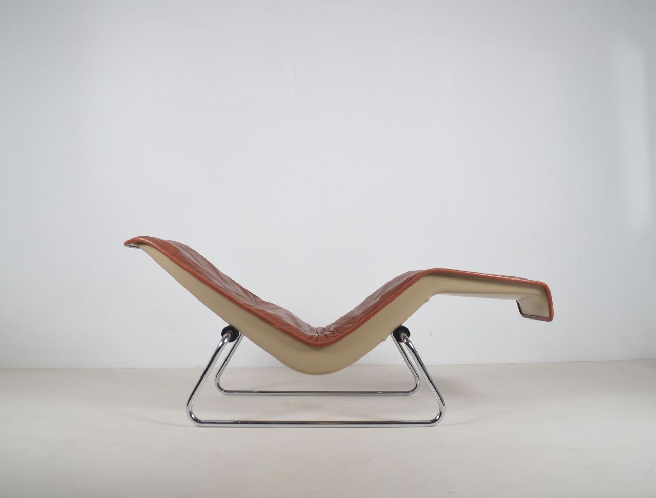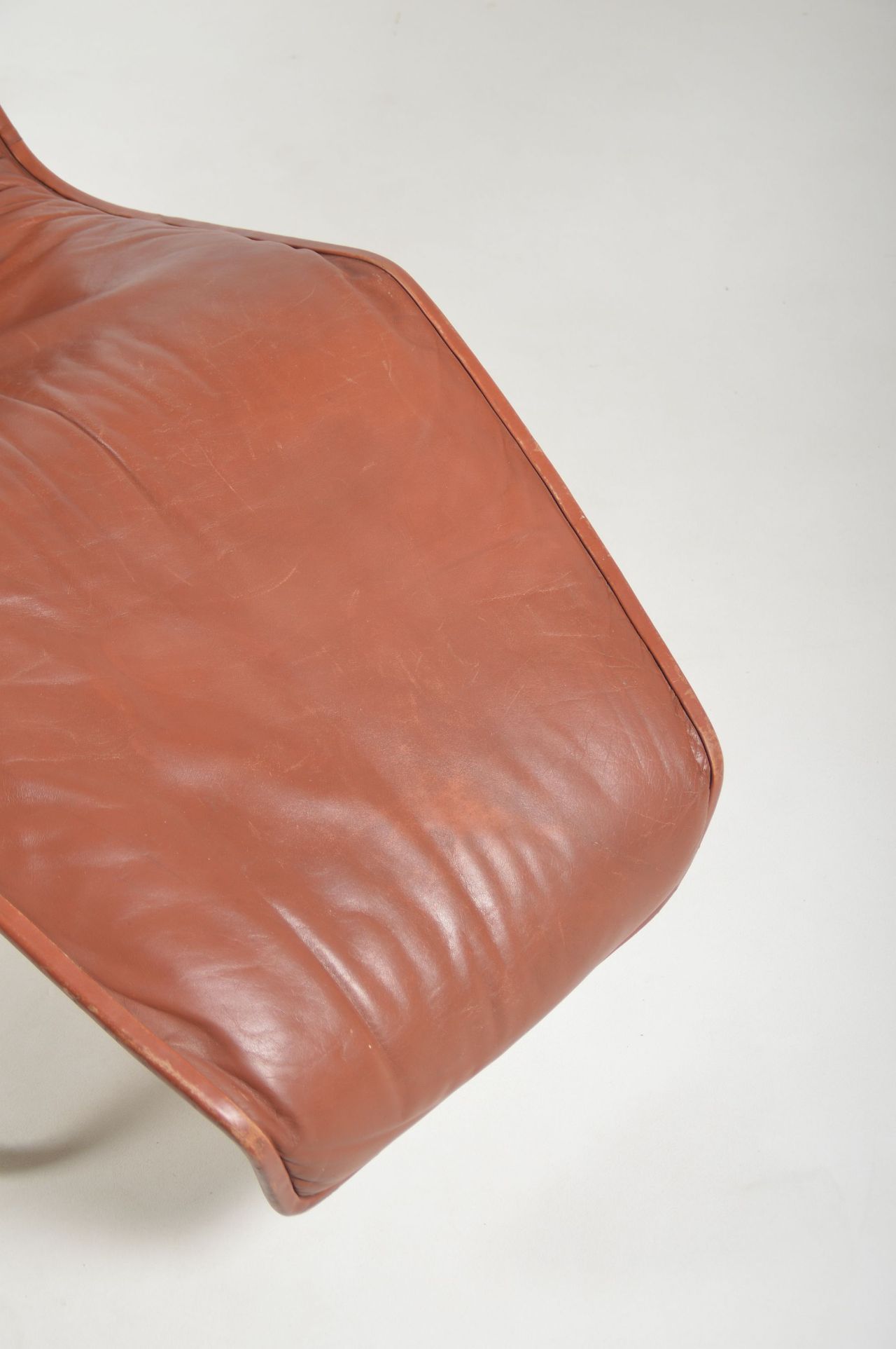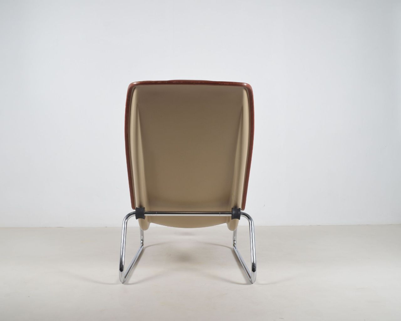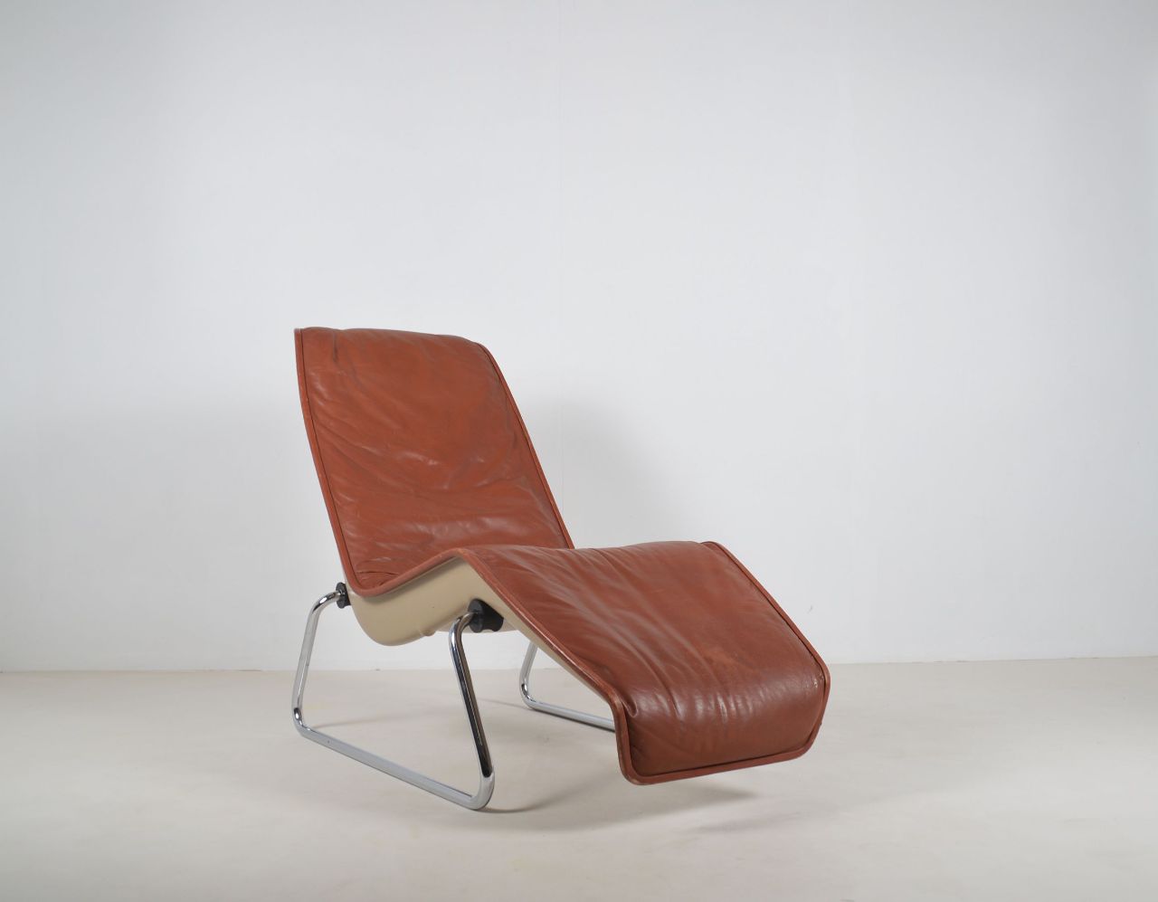 This armchair features a sturdy plastic shell upholstered in cognac-colored leather. The shell rests on a chrome-plated metal base, creating the illusion of weightlessness. It can also be adjusted from a sitting to a reclining position, ensuring optimal comfort.