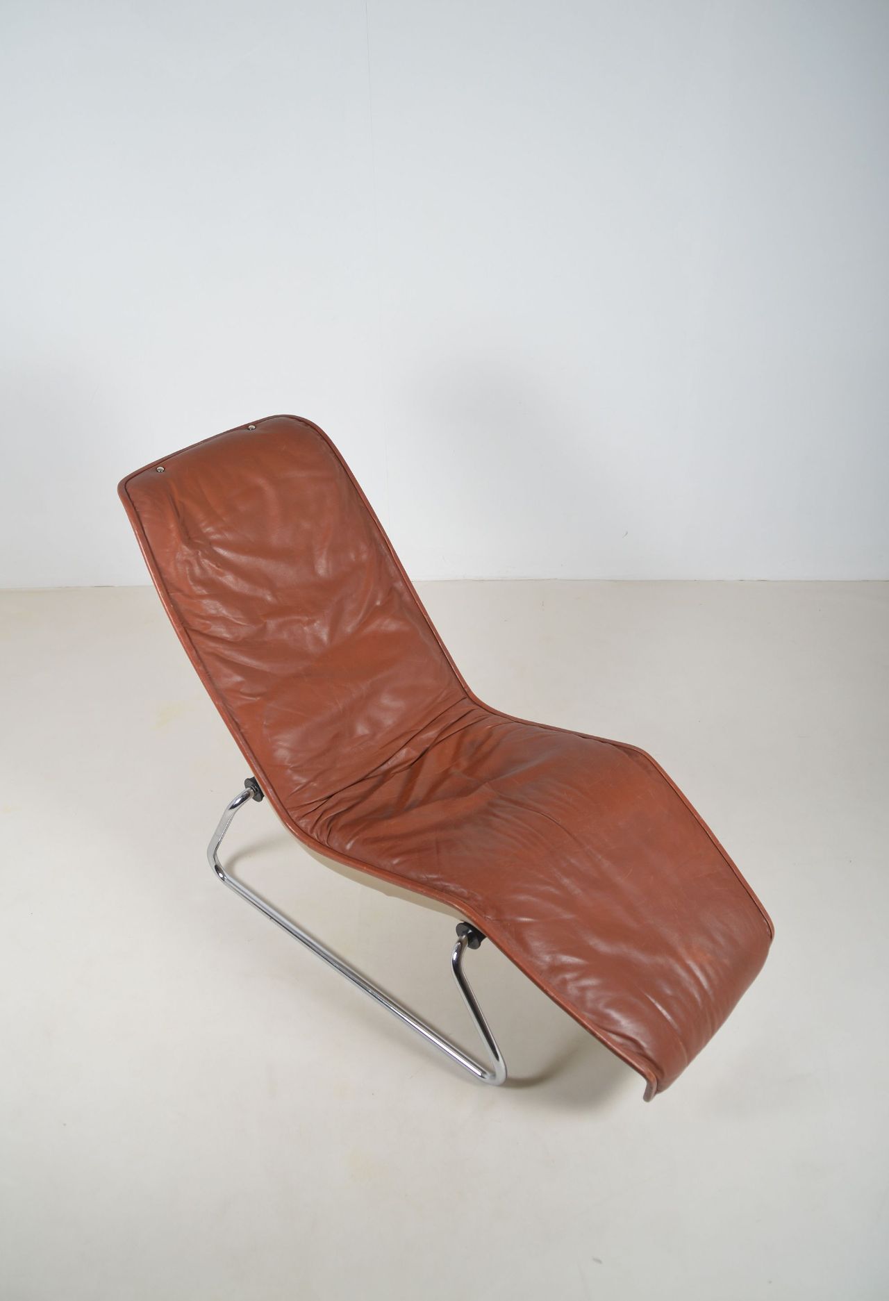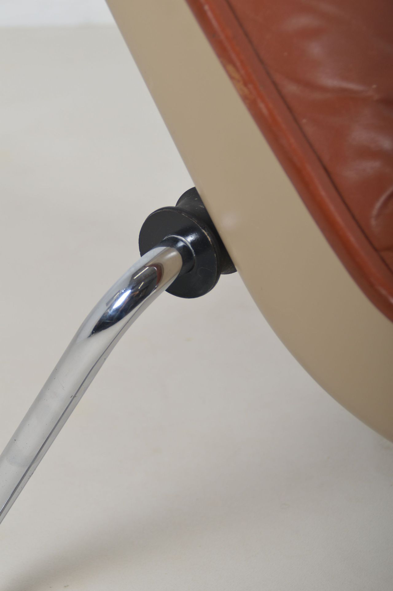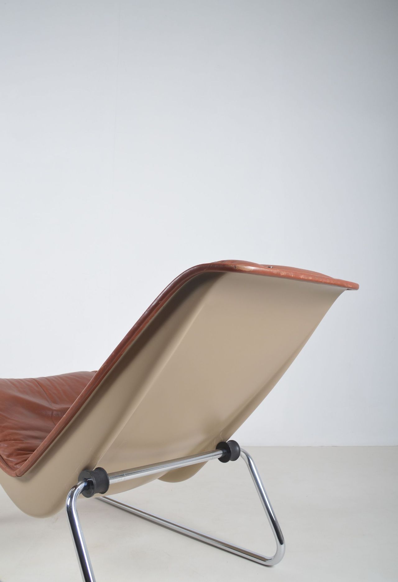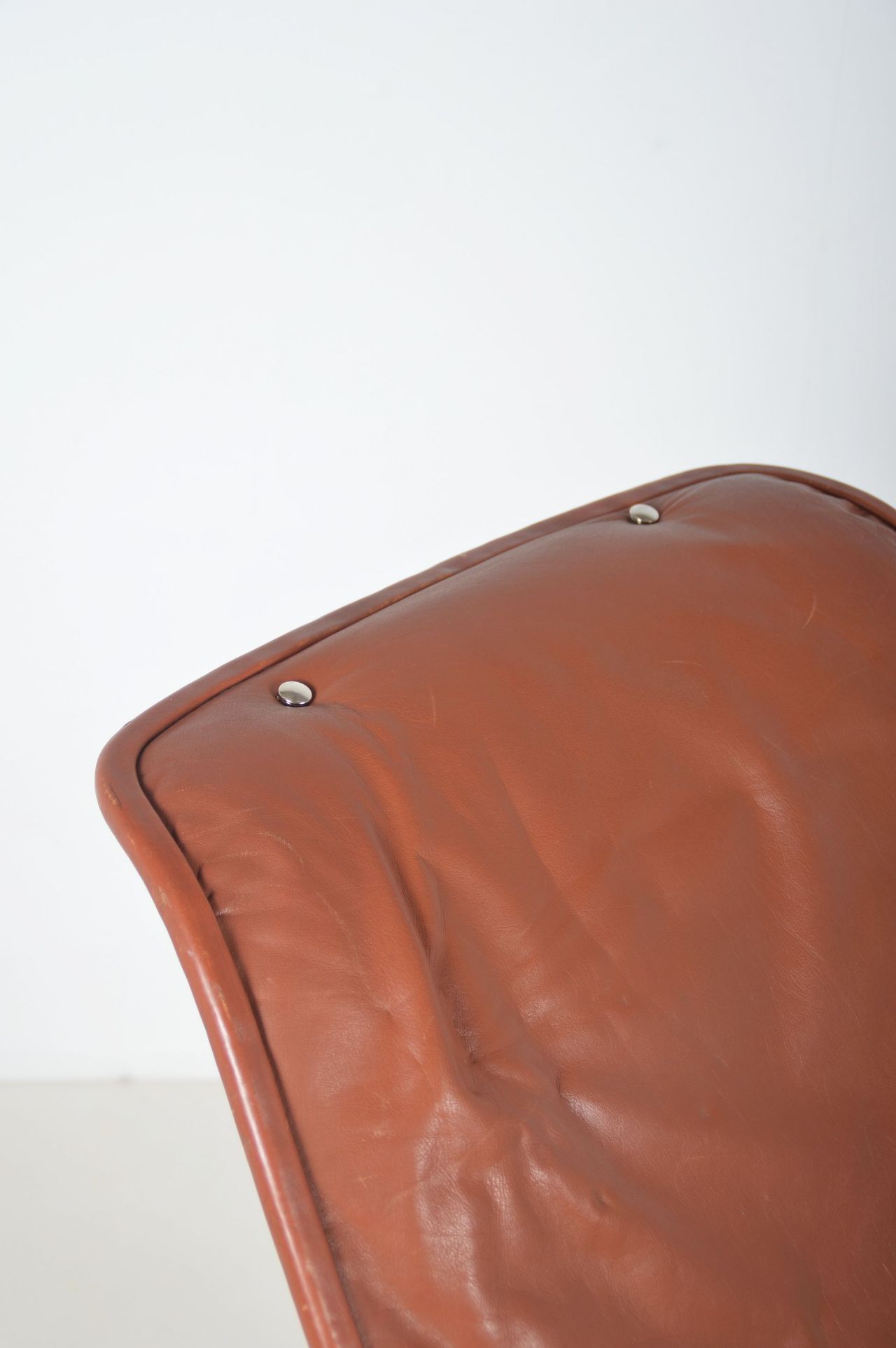 This armchair features a sturdy plastic shell upholstered in cognac-colored leather. The shell rests on a chrome-plated metal base, creating the illusion of weightlessness. It can also be adjusted from a sitting to a reclining position, ensuring optimal comfort.